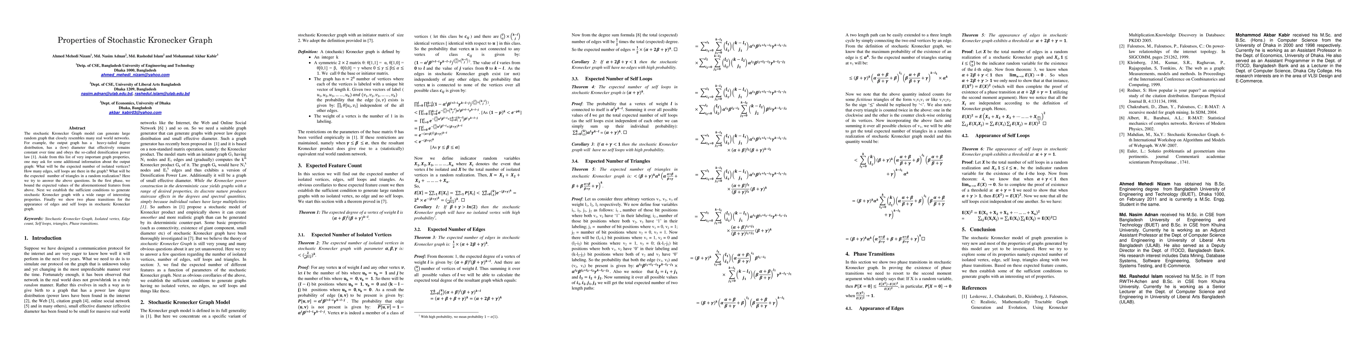 This paper investigates the properties of stochastic Kronecker Graphs, focusing on their resemblance to real-world networks, including heavy-tailed degree distribution and constant diameter. It also explores the expected number of isolated vertices, edges, self loops, and triangles, establishing bounds and conditions for generating graphs with desired properties, and identifies two phase transitions for the appearance of edges and self loops.