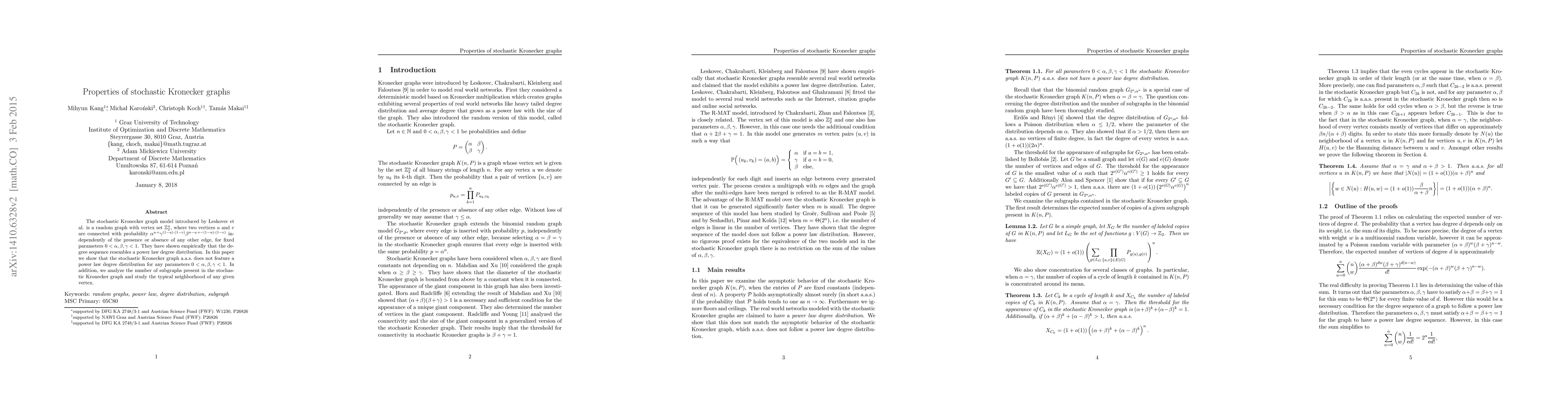 This paper investigates the stochastic Kronecker graph model, demonstrating that it does not exhibit a power law degree distribution under any parameter settings. Additionally, it analyzes the number of subgraphs and the typical neighborhood structure within the graph.