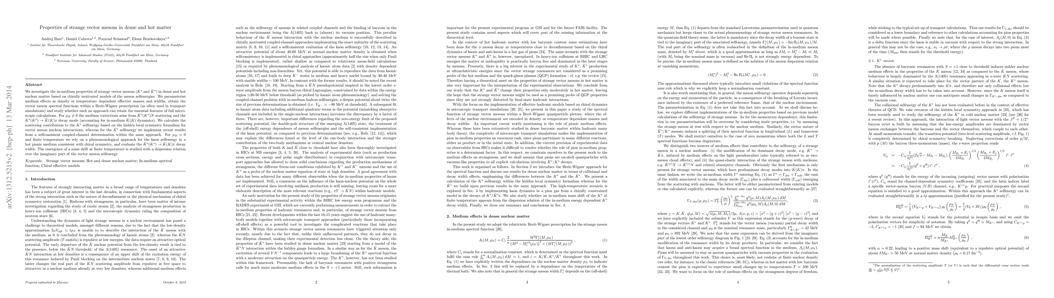 This paper investigates the in-medium properties of strange vector mesons ($K^*$ and $\bar K^*$) in dense and hot nuclear matter using chirally motivated models. It examines how medium effects influence the effective masses and widths of these mesons, comparing phenomenological approaches to full microscopic calculations.