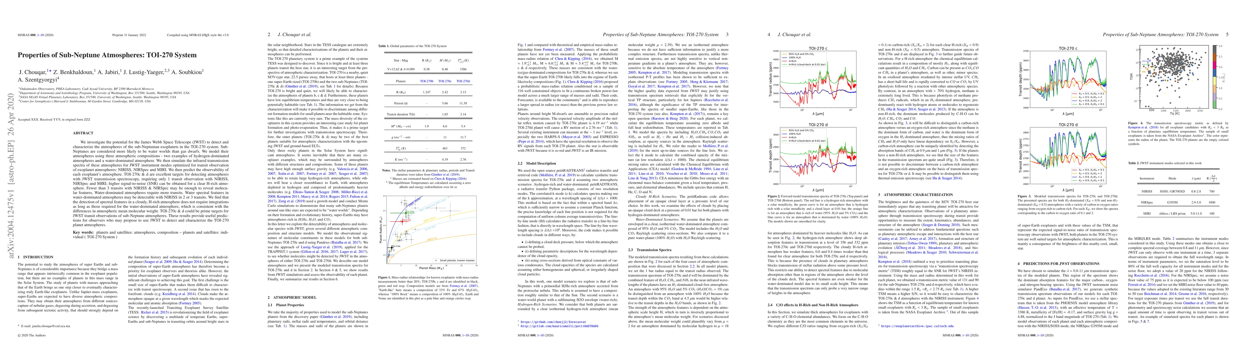 This study explores the potential of JWST to detect and characterize the atmospheres of sub-Neptunes in the TOI-270 system, modeling three compositions: hydrogen-dominated and water-dominated atmospheres. It predicts that TOI-270c and d are optimal targets for JWST's NIRISS, NIRSpec, and MIRI instruments, requiring only 1 transit observation for clear hydrogen-rich atmospheres.
