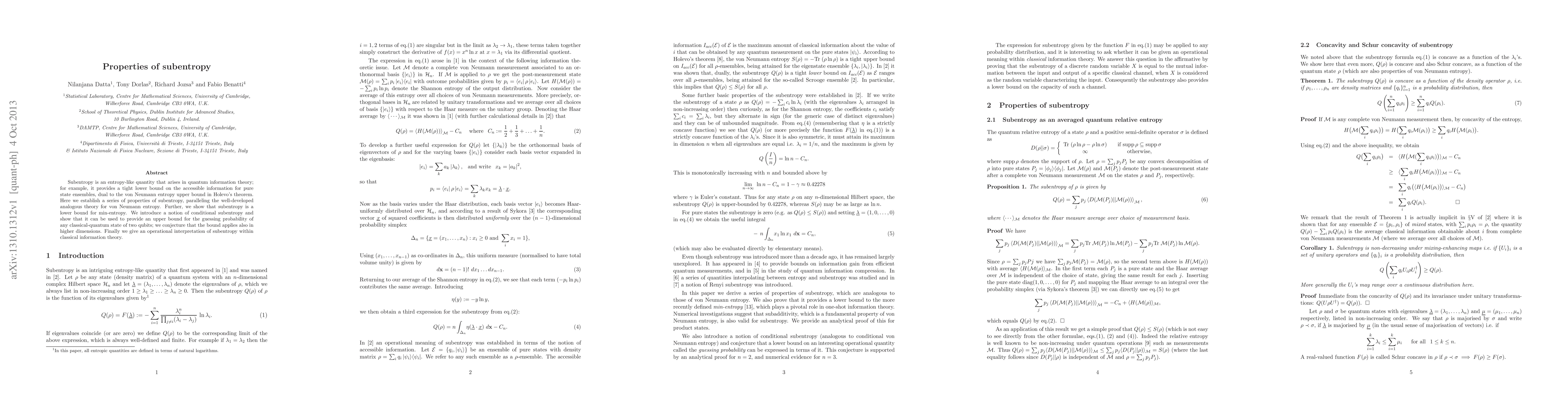Subentropy is an entropy-like quantity that arises in quantum information theory; for example, it provides a tight lower bound on the accessible information for pure state ensembles, dual to the von Neumann entropy upper bound in Holevo's theorem. Here we establish a series of properties of subentropy, paralleling the well-developed analogous theory for von Neumann entropy. Further, we show that subentropy is a lower bound for min-entropy. We introduce a notion of conditional subentropy and show that it can be used to provide an upper bound for the guessing probability of any classical-quantum state of two qubits; we conjecture that the bound applies also in higher dimensions. Finally we give an operational interpretation of subentropy within classical information theory.