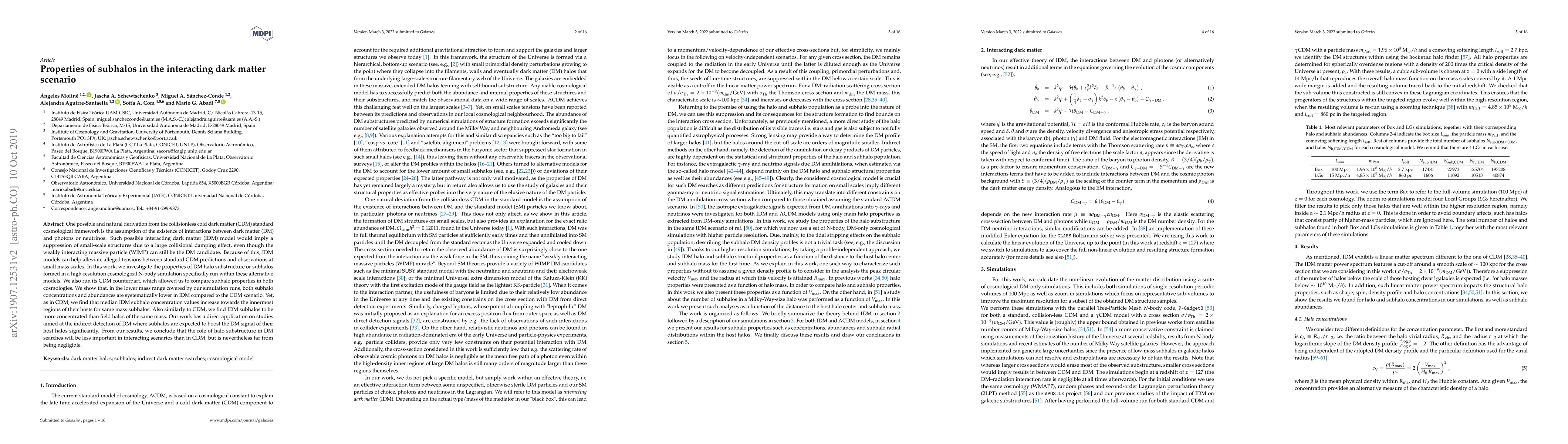 Subhalos in interacting dark matter scenarios have lower concentrations and abundances than in collisionless cold dark matter models, but still show characteristic inner halo behavior.