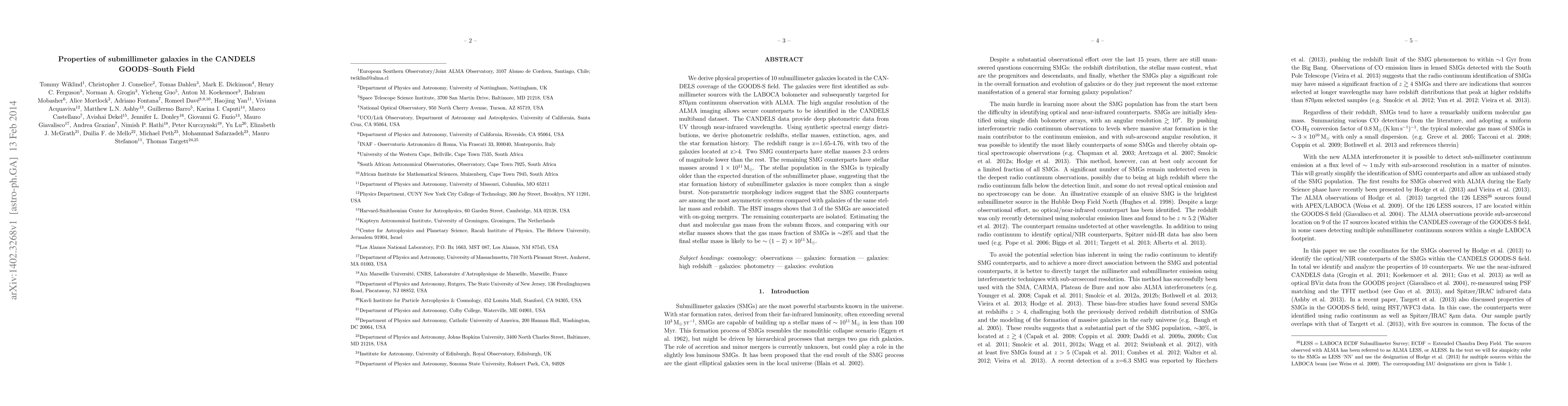We derive physical properties of 10 submillimeter galaxies located in the CANDELS coverage of the GOODS-S field. The galaxies were first identified as submillimeter sources with the LABOCA bolometer and subsequently targeted for 870um continuum observation with ALMA. The high angular resolution of the ALMA imaging allows secure counterparts to be identified in the CANDELS multiband dataset. The CANDELS data provide deep photometric data from UV through near-infrared wavelengths. Using synthetic spectral energy distributions, we derive photometric redshifts, stellar masses, extinction, ages, and the star formation history. The redshift range is z=1.65-4.76, with two of the galaxies located at z>4. Two SMG counterparts have stellar masses 2-3 orders of magnitude lower than the rest. The remaining SMG counterparts have stellar masses around 1x10^11 Msun. The stellar population in the SMGs is typically older than the expected duration of the submillimeter phase, suggesting that the star formation history of submillimeter galaxies is more complex than a single burst. Non-parametric morphology indices suggest that the SMG counterparts are among the most asymmetric systems compared with galaxies of the same stellar mass and redshift. The HST images shows that 3 of the SMGs are associated with on-going mergers. The remaining counterparts are isolated. Estimating the dust and molecular gas mass from the submm fluxes, and comparing with our stellar masses shows that the molecular gas mass fraction of SMGs is ~28% and that the final stellar mass is likely to be (1-2)x10^11 Msun.