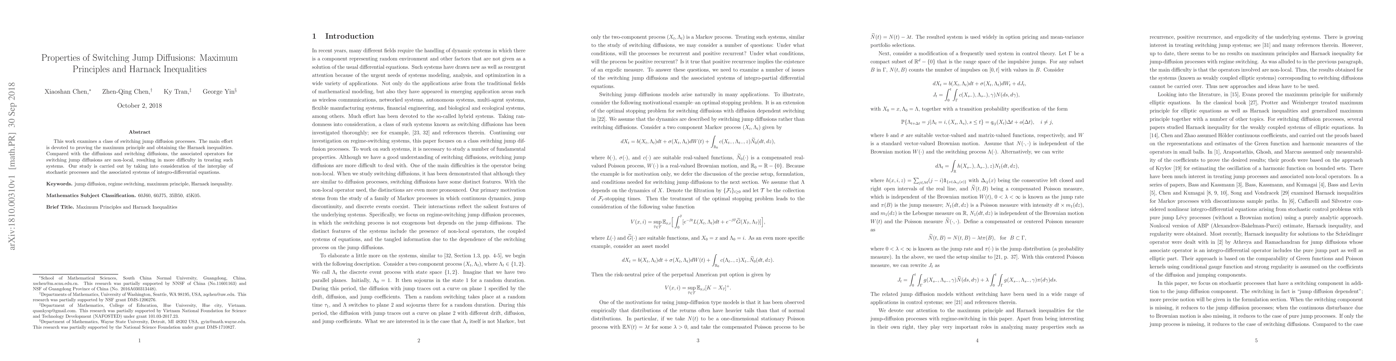 This paper investigates switching jump diffusion processes, proving maximum principles and deriving Harnack inequalities. The non-local nature of the associated operators, due to the jump component, adds complexity, which is addressed through the interplay of stochastic processes and integro-differential equations.