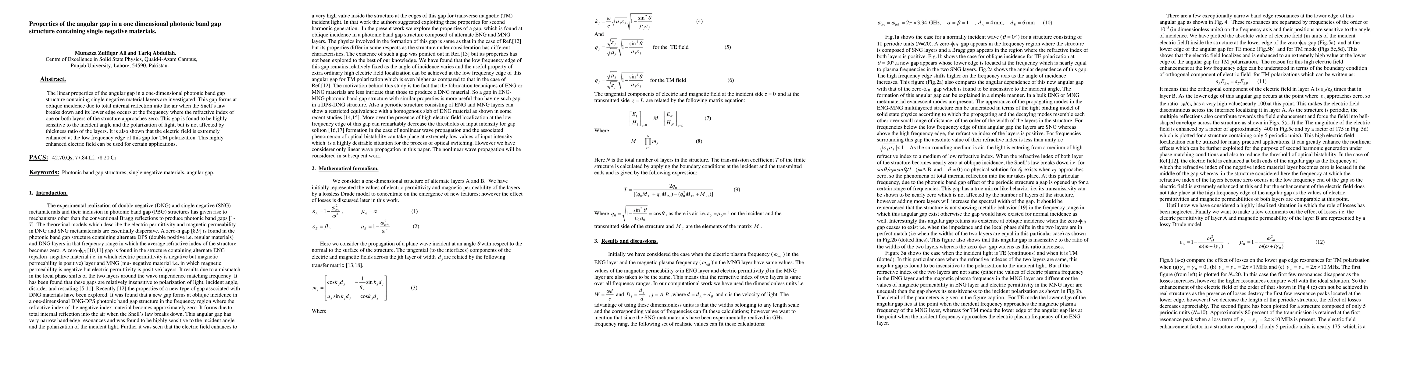 The linear properties of the angular gap in a one dimensional photonic band gap structure containing single negative material layers are investigated. This gap forms at oblique incidence due to total internal reflection into air when the Snell's law breaks down and its lower edge occurs at the frequency where the refractive index of one or both layers of the structure approaches zero. This gap is found to be highly sensitive to the incident angle and the polarization of light, but is not affected by thickness ratio of the layers. It is also shown that the electric field is extremely enhanced at the low frequency edge of this gap for transverse magnetic polarization. This highly enhanced electric field can be used for certain applications.