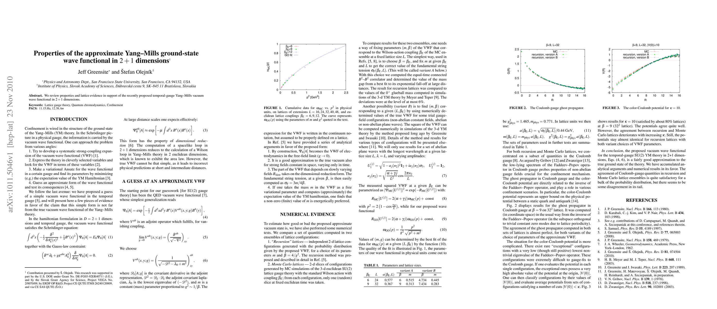 Summary: This paper reviews the properties and lattice evidence supporting the proposed temporal-gauge Yang-Mills vacuum wave functional in 2+1 dimensions, providing insights into the approximate Yang-Mills ground state.