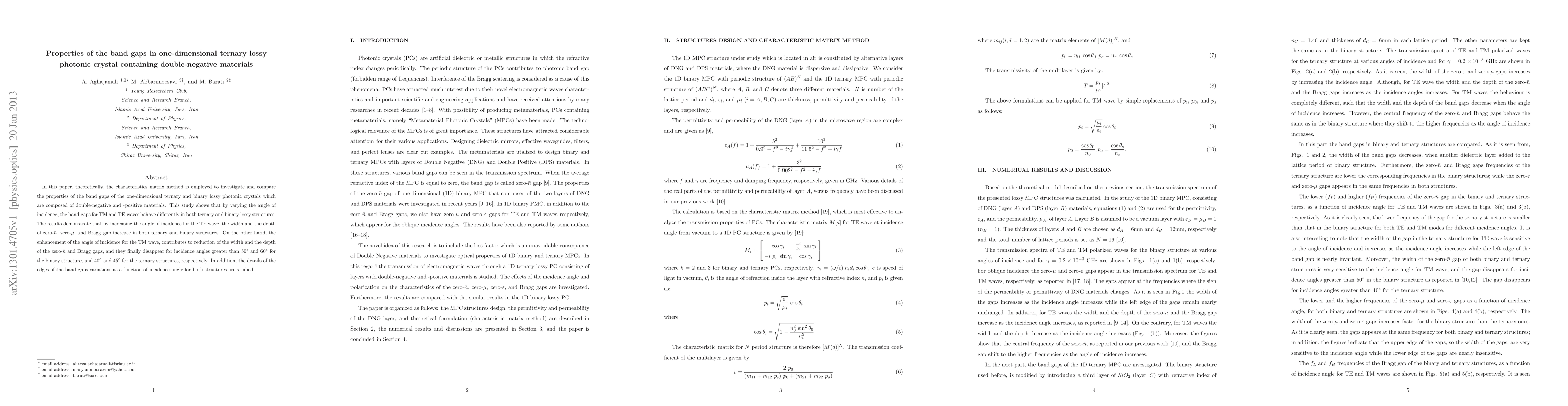 The paper presents a comparative analysis of band gap properties in ternary and binary lossy photonic crystals using the characteristics matrix method, highlighting the distinct behaviors of TM and TE waves under varying incidence angles.