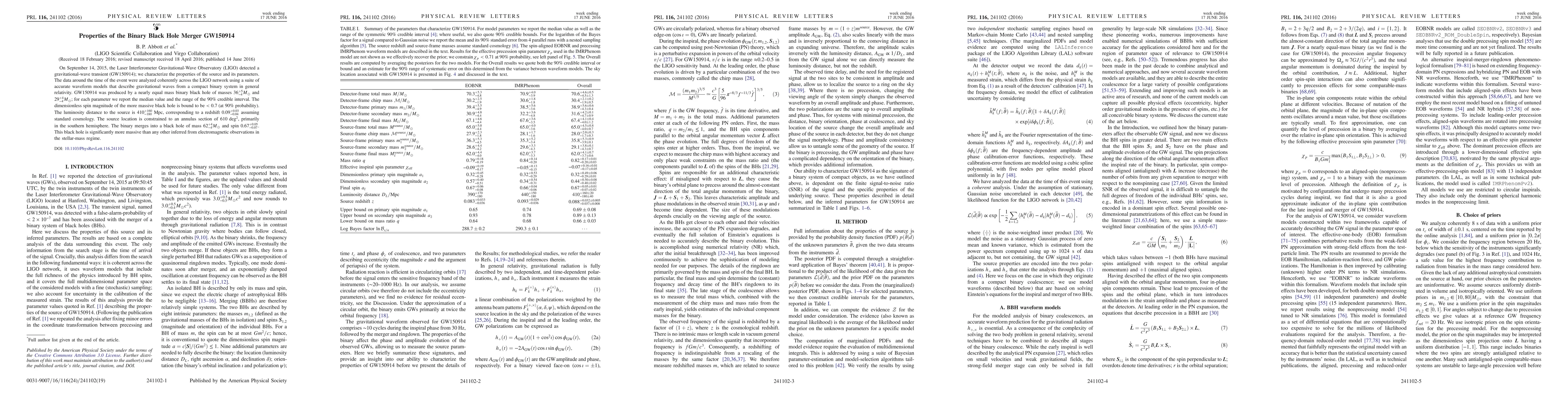 The LIGO observatory detected gravitational wave GW150914 from a binary black hole merger on September 14, 2015, comprising black holes of 36 and 29 solar masses, merging into a 62 solar mass black hole with a spin of 0.67. The source is located 410 Mpc away, primarily in the southern hemisphere.