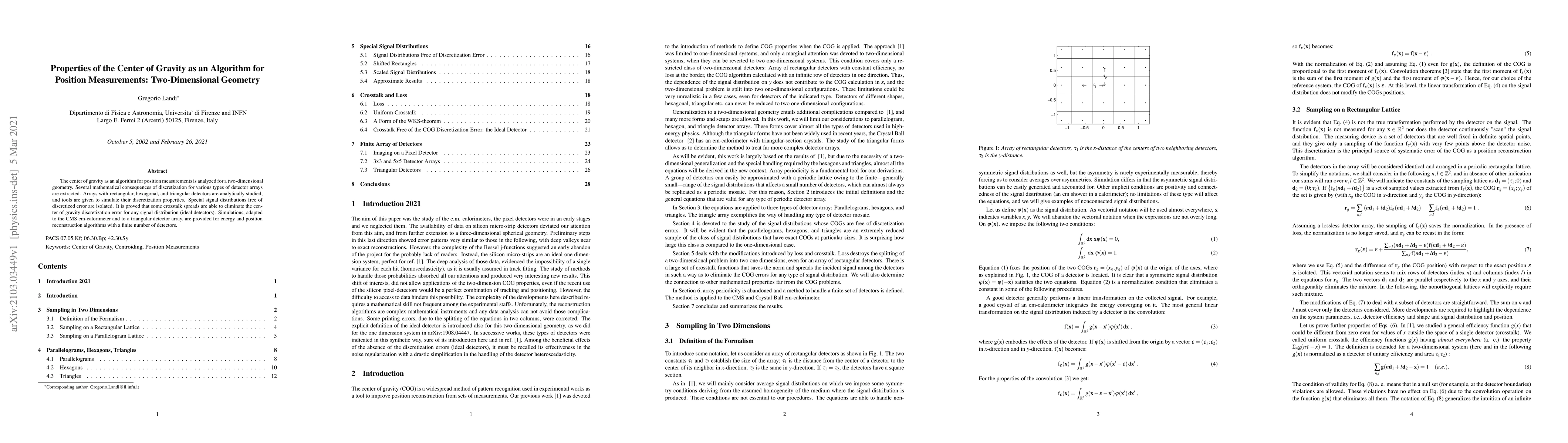The center of gravity as an algorithm for position measurements is analyzed for a two-dimensional geometry. Several mathematical consequences of discretization for various types of detector arrays are extracted. Arrays with rectangular, hexagonal, and triangular detectors are analytically studied, and tools are given to simulate their discretization properties. Special signal distributions free of discretized error are isolated. It is proved that some crosstalk spreads are able to eliminate the center of gravity discretization error for any signal distribution (ideal detectors). Simulations, adapted to the CMS em-calorimeter and to a triangular detector array, are provided for energy and position reconstruction algorithms with a finite number of detectors.