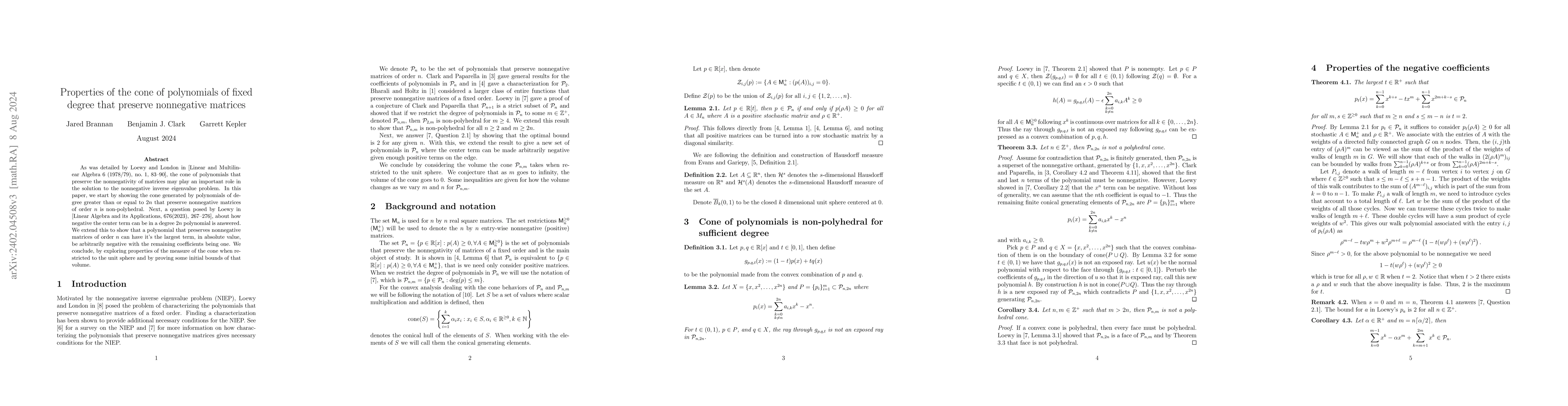 As was detailed by Loewy and London in [Linear and Multilinear Algebra 6 (1978/79), no.~1, 83--90], the cone of polynomials that preserve the nonnegativity of matrices may play an important role in the solution to the nonnegative inverse eigenvalue problem. In this paper, we start by showing the cone generated by polynomials of degree greater than or equal to $2n$ that preserve nonnegative matrices of order $n$ is non-polyhedral. Then it is shown, that a polynomial that preserves nonnegative matrices of order $n$ can have all the center terms be negative. These polynomials can also have the largest term, in absolute value, be arbitrarily negative with the remaining coefficients being one. We explore properties of the measure of the cone when restricted to the unit sphere and prove some initial bounds of that volume.