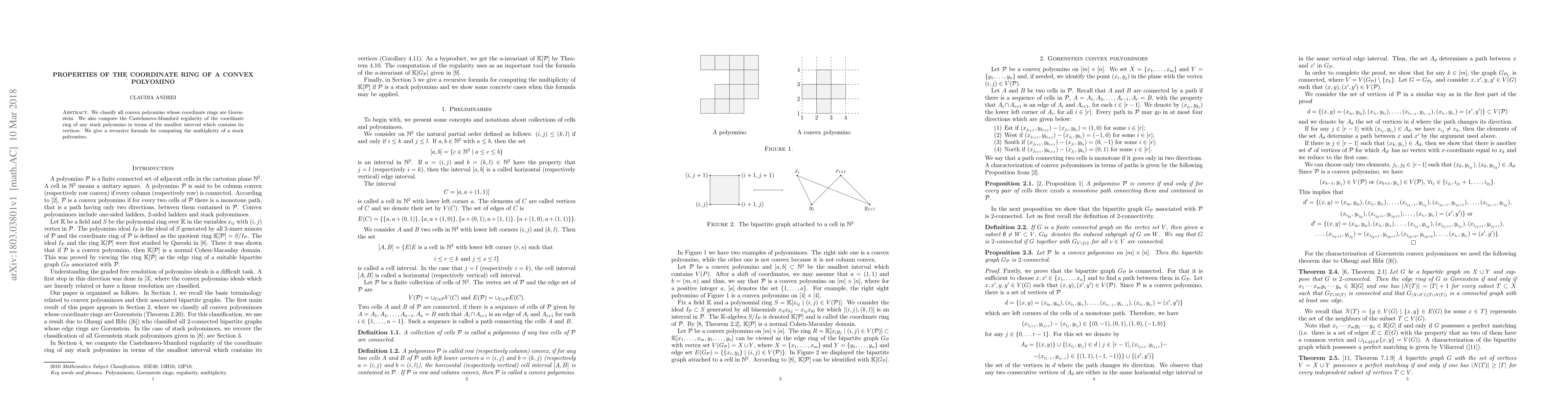 We classify all convex polyomino whose coordinate rings are Gorenstein. We also compute the Castelnuovo-Mumford regularity of the coordinate ring of any stack polyomino in terms of the smallest interval which contains its vertices. We give a recursive formula for computing the multiplicity of a stack polyomino.