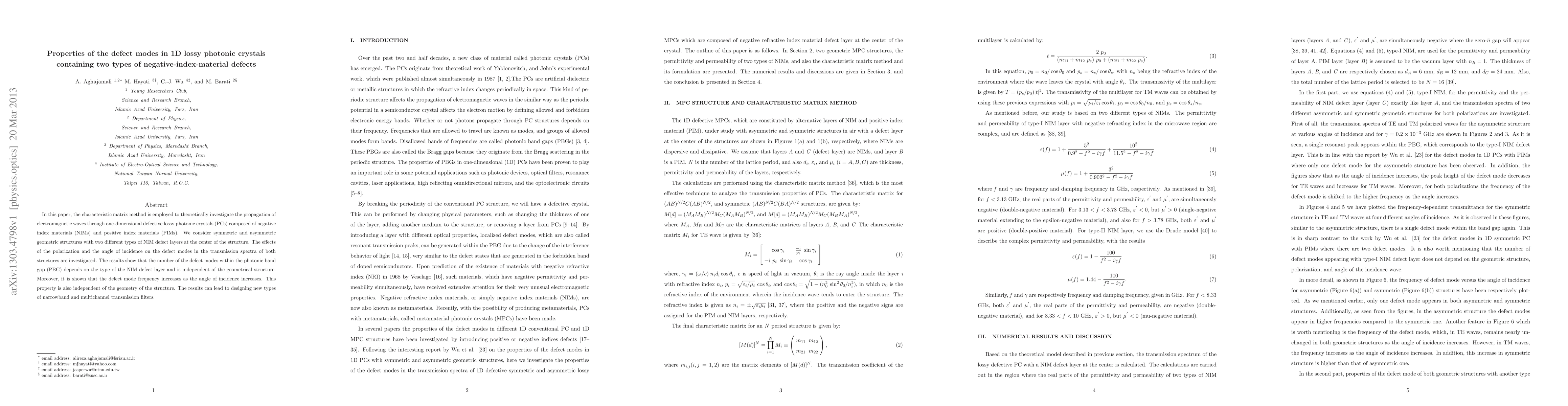 This paper explores electromagnetic wave propagation in 1D lossy photonic crystals with two types of negative-index-material defects using the characteristic matrix method. The study reveals that the number of defect modes within the photonic band gap depends on the NIM defect type, while their frequency increases with the angle of incidence, regardless of the structure's geometry.