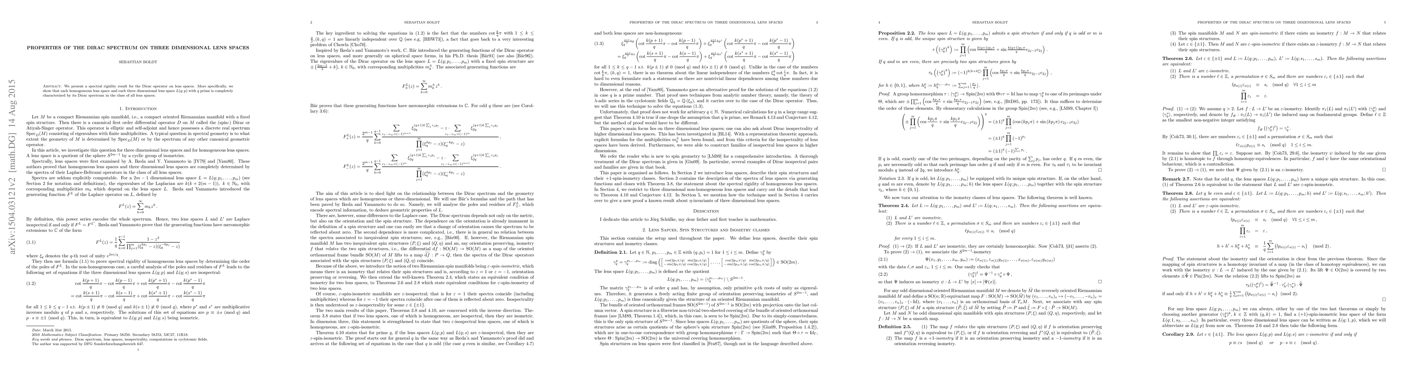 This paper demonstrates that the Dirac spectrum uniquely identifies homogeneous lens spaces and three-dimensional lens spaces $L(q;p)$ where $q$ is prime, establishing spectral rigidity for these spaces. The Dirac operator's spectrum serves as a complete characterization within the class of lens spaces.