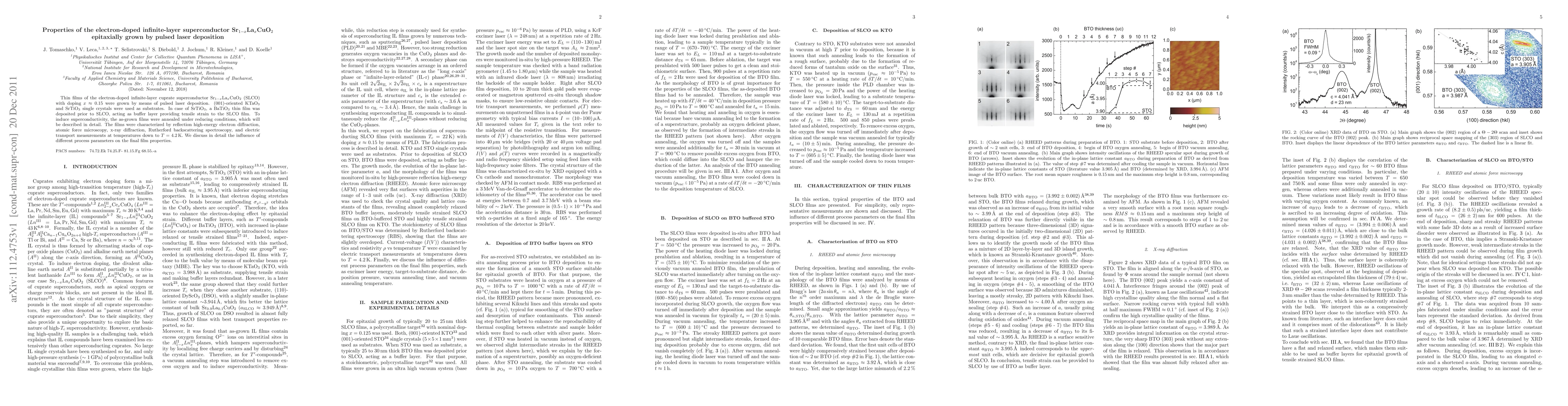 Thin films of the electron-doped infinite-layer cuprate superconductor Sr$_{1-x}$La$_x$CuO$_2$ (SLCO) with doping $x \approx 0.15$ were grown by means of pulsed laser deposition. (001)-oriented KTaO$_3$ and SrTiO$_3$ single crystals were used as substrates. In case of SrTiO$_3$, a BaTiO$_3$ thin film was deposited prior to SLCO, acting as buffer layer providing tensile strain to the SLCO film. To induce superconductivity, the as-grown films were annealed under reducing conditions, which will be described in detail. The films were characterized by reflection high-energy electron diffraction, atomic force microscopy, x-ray diffraction, Rutherford backscattering spectroscopy, and electric transport measurements at temperatures down to $T = 4.2\,$K. We discuss in detail the influence of different process parameters on the final film properties.