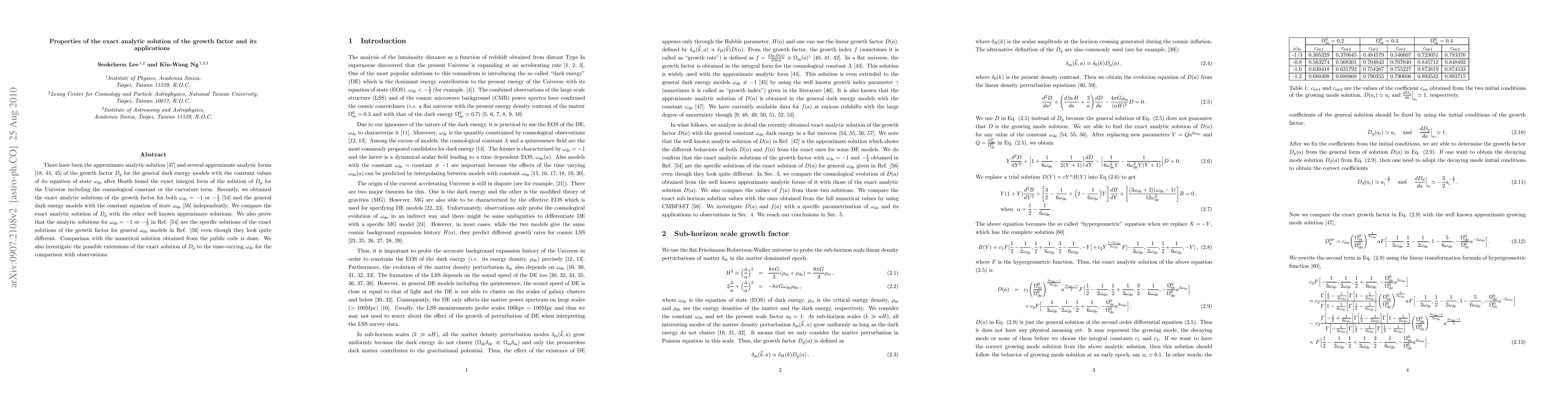 There have been the approximate analytic solution \cite{Silveria} and several approximate analytic forms \cite{0508156,Carroll,0303112} of the growth factor $D_{g}$ for the general dark energy models with the constant values of its equation of state $\omde$ after Heath found the exact integral form of the solution of $D_{g}$ for the Universe including the cosmological constant or the curvature term. Recently, we obtained the exact analytic solutions of the growth factor for both $\omde = -1$ or $-\fr{1}{3}$ \cite{SK1} and the general dark energy models with the constant equation of state $\omde$ \cite{SK3} independently. We compare the exact analytic solution of $D_{g}$ with the other well known approximate solutions. We also prove that the analytic solutions for $\omde = -1$ or $-\fr{1}{3}$ in Ref. \cite{SK1} are the specific solutions of the exact solutions of the growth factor for general $\omde$ models in Ref. \cite{SK3} even though they look quite different. We scrutinize the issue of using the well known parameterizations of the growth index and its parameter given in Ref. \cite{WS} to obtain the growth factor for general dark energy models. We also investigate the possible extensions of the exact solution of $D_{g}$ to the time-varying $\omde$ for the comparison with observations.