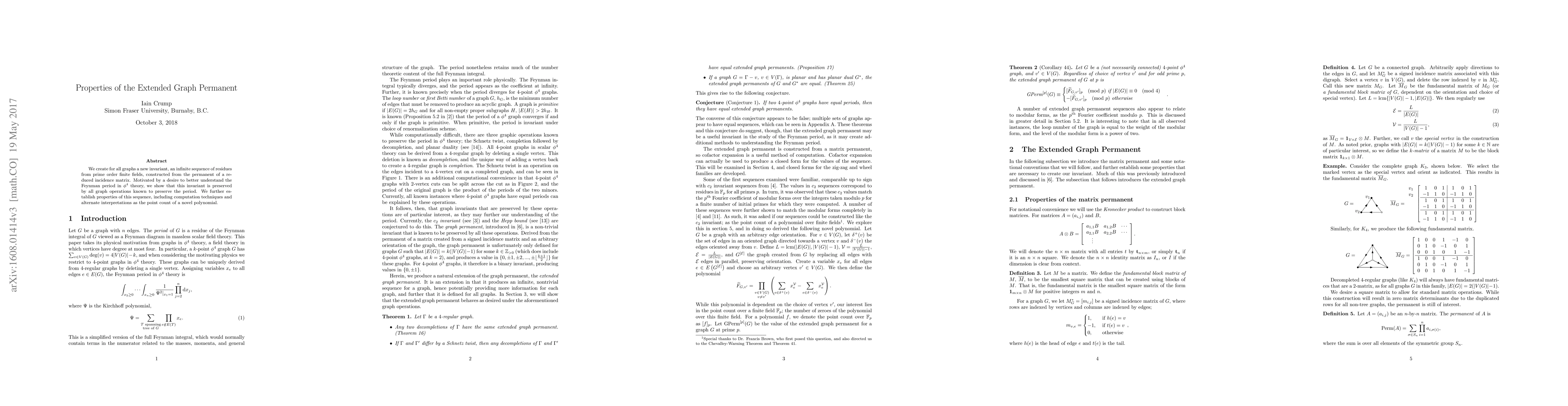 Previously, the graph permanent was introduced as a single-valued invariant for graphs $G$ with $|E(G)| = k(|V(G)|-1)$ for some $k \in \mathbb{Z}_{>0}$. Herein, we construct the extended graph permanent, an infinite sequence for all graphs. We prove that, like the graph permanent, the extended graph permanent is invariant under the graph operations that are known to preserve the period. Further, the original construction and extension arise from permanents of matrices, but we construct a novel graph polynomial such that the sequence can be generated from the point count of this polynomial, as a residue over prime-order finite fields.