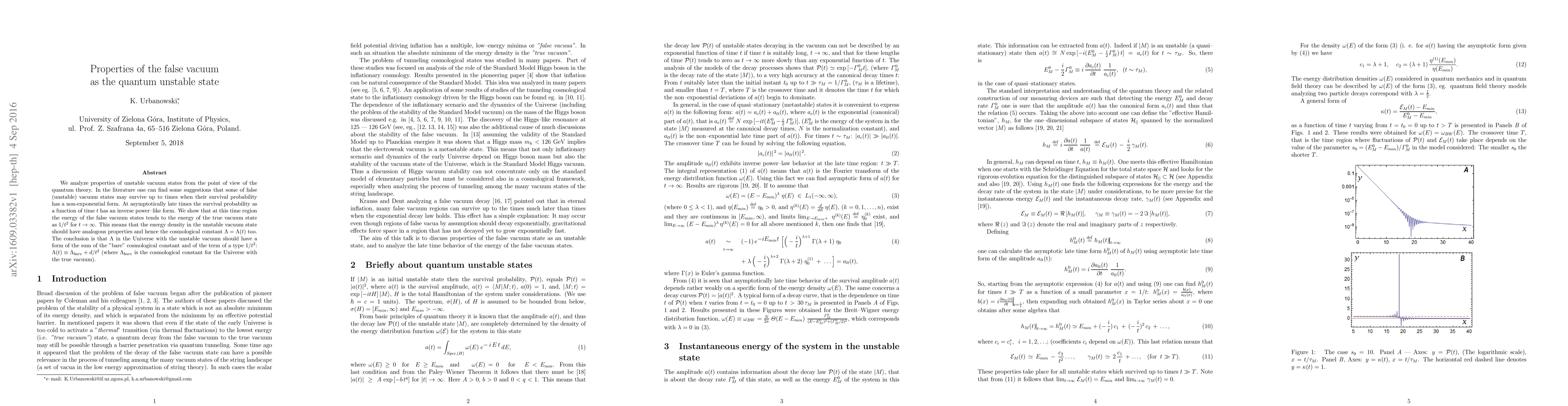 This paper explores the properties of unstable vacuum states in quantum theory, demonstrating that their survival probability at late times follows an inverse power-like form. It concludes that the energy density and cosmological constant in such a universe evolve as $\Lambda(t) \equiv \Lambda_{bare} + d/t^{2}$, where $\Lambda_{bare}$ is the constant for a true vacuum universe.