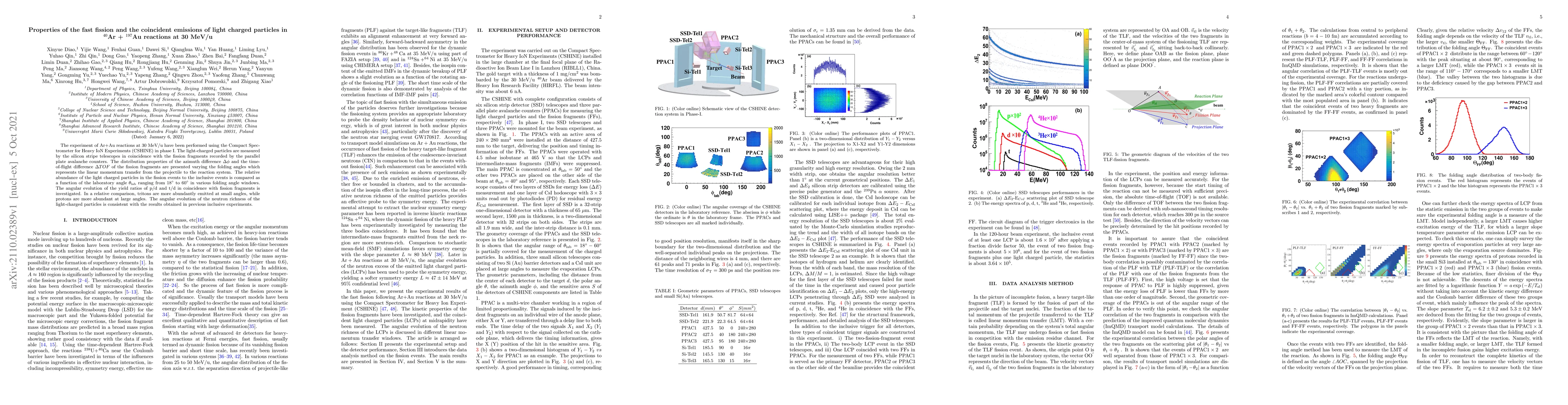 The experiment of Ar+Au reactions at 30 MeV/u have been performed using the Compact Spectrometer for Heavy IoN Experiments (CSHINE) in phase I. The light-charged particles are measured by the silicon stripe telescopes in coincidence with the fission fragments recorded by the parallel plate avalanche counters. The distribution properties of the azimuth difference $\Delta \phi$ and the time-of-flight difference $\Delta TOF$ of the fission fragments are presented varying the folding angles which represents the linear momentum transfer from the projectile to the reaction system. The relative abundance of the light charged particles in the fission events to the inclusive events is compared as a function of the laboratory angle $\theta_{\rm lab}$ ranging from $18^\circ$ to $60^\circ$ in various folding angle windows. The angular evolution of the yield ratios of p/d and t/d in coincidence with fission fragments is investigated. In a relative comparison, tritons are more abundantly emitted at small angles, while protons are more abundant at large angles. The angular evolution of the neutron richness of the light-charged particles is consistent with the results obtained in previous inclusive experiments.