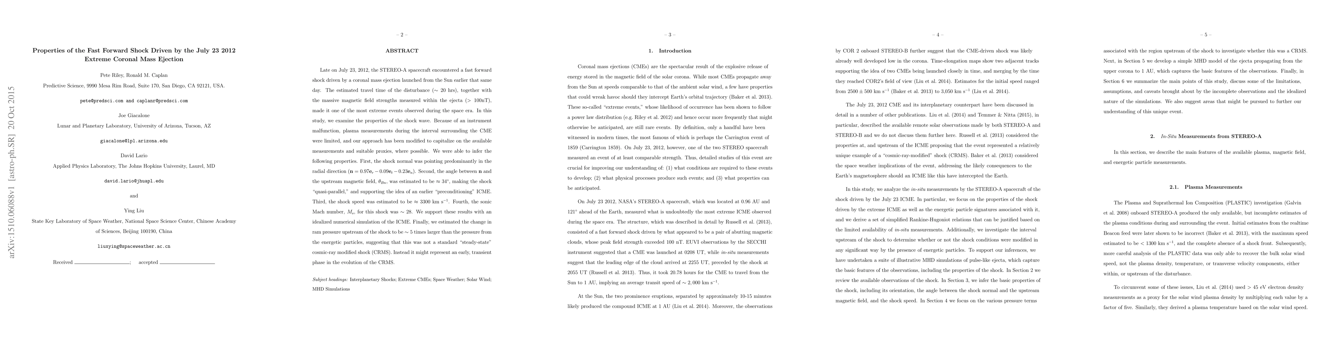 Late on July 23, 2012, the STEREO-A spacecraft encountered a fast forward shock driven by a coronal mass ejection launched from the Sun earlier that same day. The estimated travel time of the disturbance ($\sim 20$ hrs), together with the massive magnetic field strengths measured within the ejecta ($> 100$nT), made it one of the most extreme events observed during the space era. In this study, we examine the properties of the shock wave. Because of an instrument malfunction, plasma measurements during the interval surrounding the CME were limited, and our approach has been modified to capitalize on the available measurements and suitable proxies, where possible. We were able to infer the following properties. First, the shock normal was pointing predominantly in the radial direction (${\bf n} = 0.97 {\bf e}_r -0.09 {\bf e}_t -0.23 {\bf e}_n$). Second, the angle between ${\bf n}$ and the upstream magnetic field, $\theta_{Bn}$, was estimated to be $\approx 34^{\circ}$, making the shock "quasi-parallel," and supporting the idea of an earlier "preconditioning" ICME. Third, the shock speed was estimated to be $\approx 3300$ km s$^{-1}$. Fourth, the sonic Mach number, $M_s$, for this shock was $\sim 28$. We support these results with an idealized numerical simulation of the ICME. Finally, we estimated the change in ram pressure upstream of the shock to be $\sim 5$ times larger than the pressure from the energetic particles, suggesting that this was not a standard "steady-state" cosmic-ray modified shock (CRMS). Instead it might represent an early, transient phase in the evolution of the CRMS.