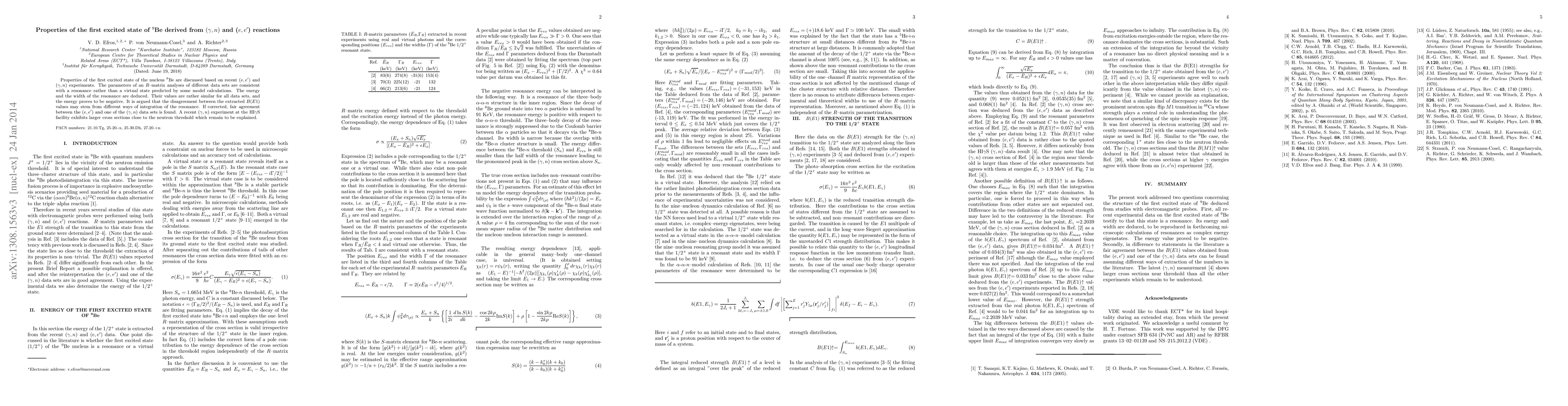 Properties of the first excited state of the nucleus 9Be are discussed based on recent (e,e') and (gamma,n) experiments. The parameters of an R-matrix analysis of different data sets are consistent with a resonance rather than a virtual state predicted by some model calculations. The energy and the width of the resonance are deduced. Their values are rather similar for all data sets, and the energy proves to be negative. It is argued that the disagreement between the extracted B(E1) values may stem from different ways of integration of the resonance. If corrected, fair agreement between the (e,e') and one of the (gamma,n) data sets is found. A recent (gamma,n) experiment at the HIgS facility exhibits larger cross sections close to the neutron threshold which remain to be explained.