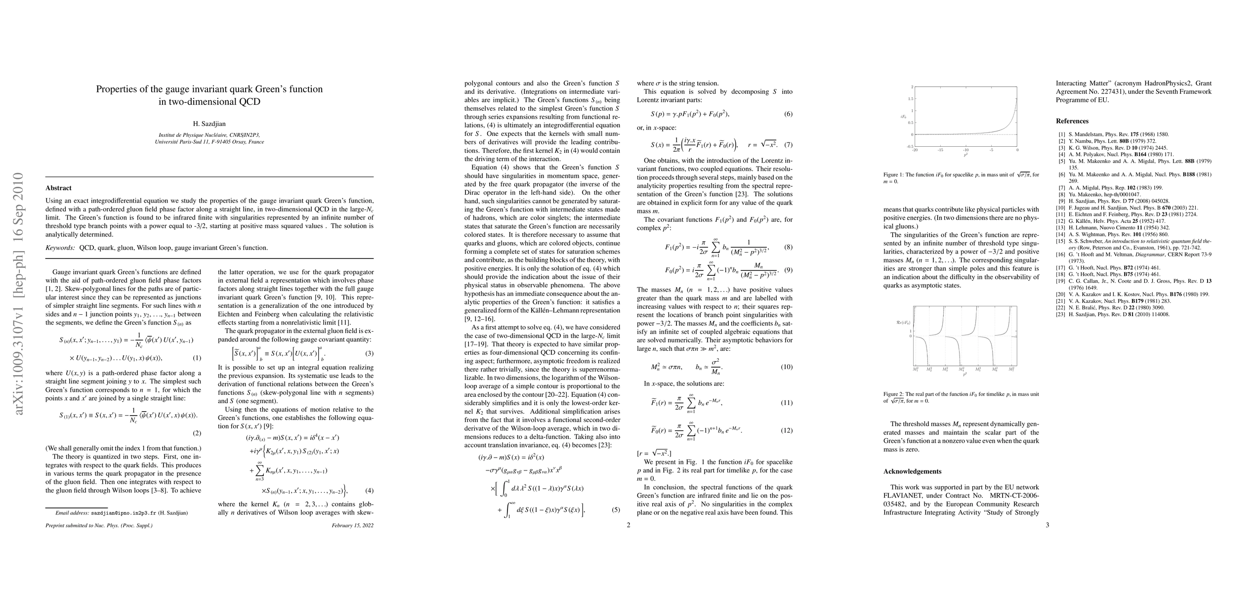This paper investigates the gauge invariant quark Green's function in two-dimensional QCD using an exact integrodifferential equation, revealing it to be infrared finite with singularities characterized by an infinite set of threshold-type branch points starting at positive mass squared values. The analytical solution is determined in the large-N_c limit.