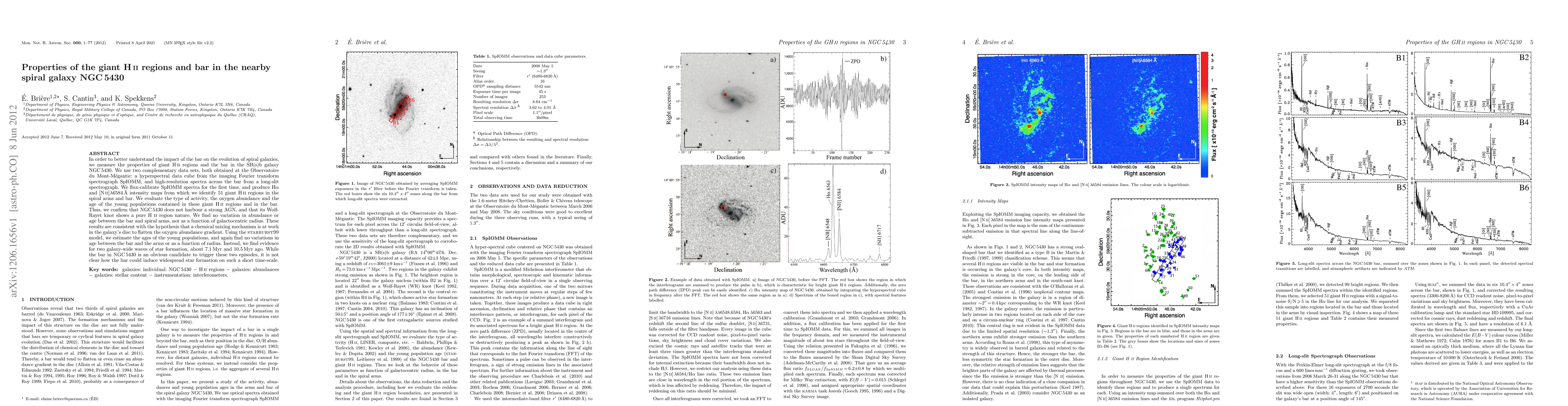In order to better understand the impact of the bar on the evolution of spiral galaxies, we measure the properties of giant HII regions and the bar in the SB(s)b galaxy NGC5430. We use two complementary data sets, both obtained at the Observatoire du Mont-M\'egantic: a hyperspectral data cube from the imaging Fourier transform spectrograph SpIOMM, and high-resolution spectra across the bar from a long-slit spectrograph. We flux-calibrate SpIOMM spectra for the first time, and produce H{\alpha} and [NII]{\lambda}6584\r{A} intensity maps from which we identify 51 giant HII regions in the spiral arms and bar. We evaluate the type of activity, the oxygen abundance and the age of the young populations contained in these giant HII regions and in the bar. Thus, we confirm that NGC5430 does not harbour a strong AGN, and that its Wolf-Rayet knot shows a pure HII region nature. We find no variation in abundance or age between the bar and spiral arms, nor as a function of galactocentric radius. These results are consistent with the hypothesis that a chemical mixing mechanism is at work in the galaxy's disc to flatten the oxygen abundance gradient. Using the starburst99 model, we estimate the ages of the young populations, and again find no variations in age between the bar and the arms or as a function of radius. Instead, we find evidence for two galaxy-wide waves of star formation, about 7.1 Myr and 10.5 Myr ago. While the bar in NGC5430 is an obvious candidate to trigger these two episodes, it is not clear how the bar could induce widespread star formation on such a short time-scale.