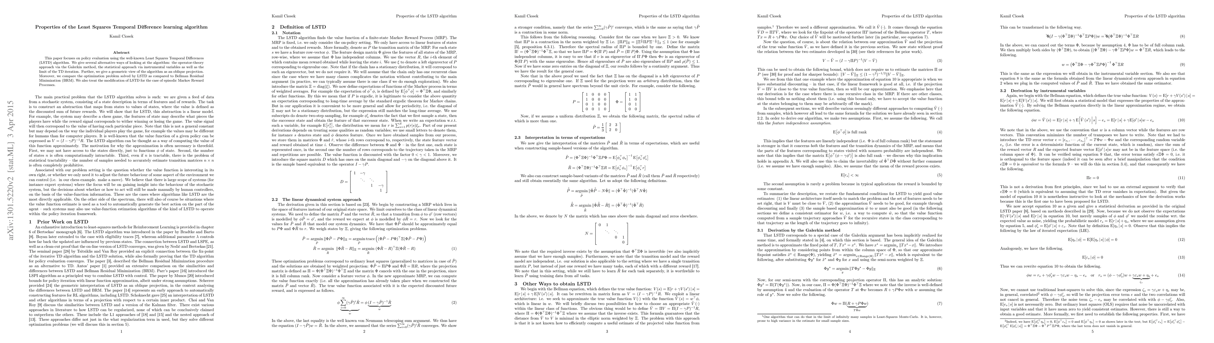 This paper presents four different ways of looking at the well-known Least Squares Temporal Differences (LSTD) algorithm for computing the value function of a Markov Reward Process, each of them leading to different insights: the operator-theory approach via the Galerkin method, the statistical approach via instrumental variables, the linear dynamical system view as well as the limit of the TD iteration. We also give a geometric view of the algorithm as an oblique projection. Furthermore, there is an extensive comparison of the optimization problem solved by LSTD as compared to Bellman Residual Minimization (BRM). We then review several schemes for the regularization of the LSTD solution. We then proceed to treat the modification of LSTD for the case of episodic Markov Reward Processes.