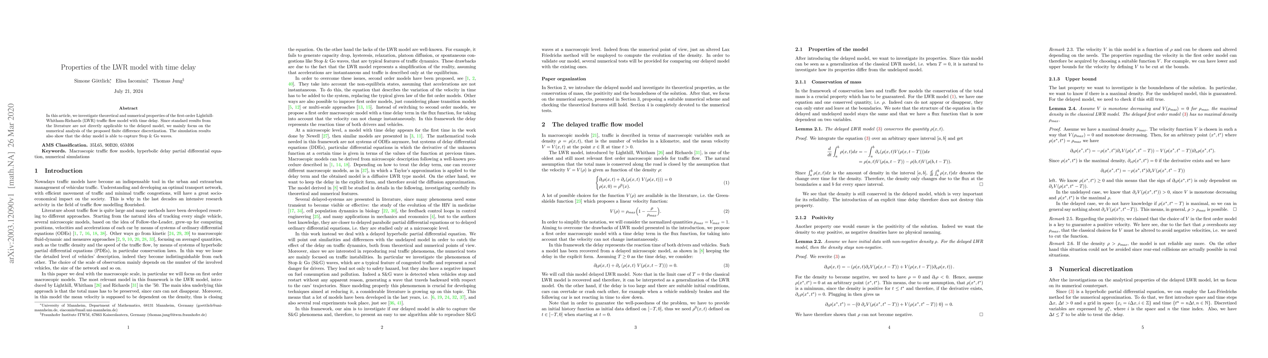 In this article, we investigate theoretical and numerical properties of the first-order Lighthill-Whitham-Richards (LWR) traffic flow model with time delay. Since standard results from the literature are not directly applicable to the delayed model, we mainly focus on the numerical analysis of the proposed finite difference discretization. The simulation results also show that the delay model is able to capture Stop & Go waves.