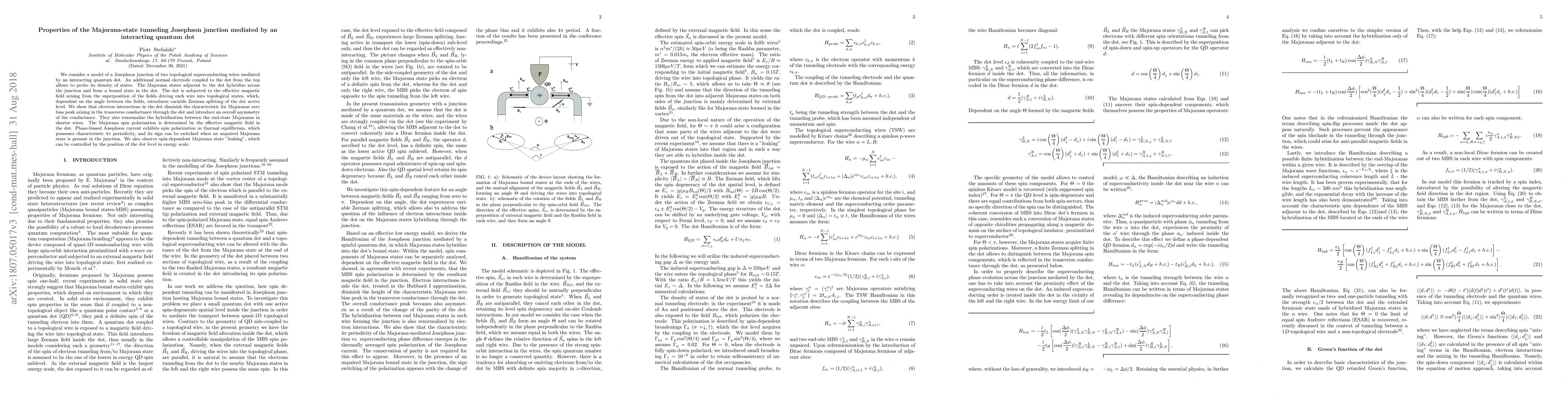 We consider a model of a Josephson junction of two topological superconducting wires mediated by an interacting quantum dot. An additional normal electrode coupled to the dot from the top allows to probe its density of states. The Majorana states adjacent to the dot hybridize across the junction and from a bound state in the dot. The dot is subjected to the effective magnetic field arising from the superposition of the fields driving each wire into topological states, which, dependent on the angle between the fields, introduces variable Zeeman splitting of the dot active level. We show that electron interactions in the dot diminish the characteristic for Majoranas zero bias peak arising in the transverse conductance through the dot and introduce an overall asymmetry of the conductance. They also renormalize the hybridization between the end-state Majoranas in shorter wires. The Majorana spin polarization is determined by the effective magnetic field in the dot. Phase-biased Josephson current exhibits spin polarization in thermal equilibrium, which possesses characteristic $4\pi$ periodicity, and its sign can be switched when an unpaired Majorana state is present in the junction. We also observe spin-dependent Majorana state "leaking", which can be controlled by the position of the dot level in energy scale.