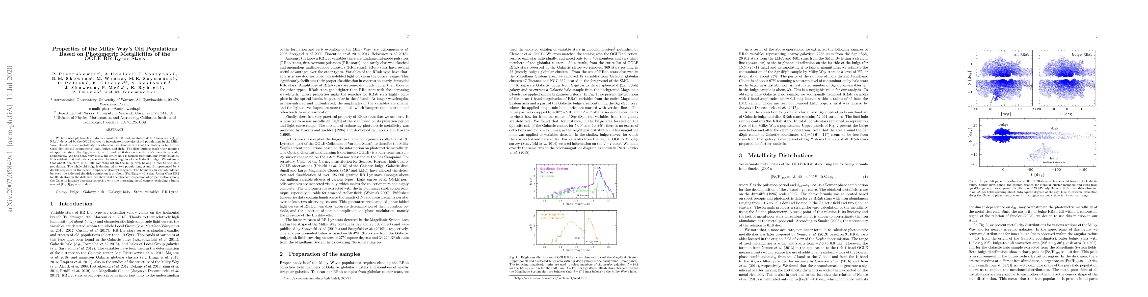 We have used photometric data on almost 91 000 fundamental-mode RR Lyrae stars (type RRab) detected by the OGLE survey to investigate properties of old populations in the Milky Way. Based on their metallicity distributions, we demonstrate that the Galaxy is built from three distinct old components: halo, bulge, and disk. The distributions reach their maxima at approximately [Fe/H]_J95 = -1.2, -1.0, and -0.6 dex on the Jurcsik's metallicity scale, respectively. We find that, very likely, the entire halo is formed from infalling dwarf galaxies. It is evident that halo stars penetrate the inner regions of the Galactic bulge. We estimate that about one-third of all RR Lyr stars within the bulge area belong in fact to the halo population. The whole old bulge is dominated by two populations, A and B, represented by a double sequence in the period-amplitude (Bailey) diagram. The boundary in iron abundance between the halo and the disk population is at about [Fe/H]_J95 = -0.8 dex. Using Gaia DR2 for RRab stars in the disk area, we show that the observed dispersion of proper motions along the Galactic latitude decreases smoothly with the increasing metal content excluding a bump around [Fe/H]_J95 = -1.0 dex.