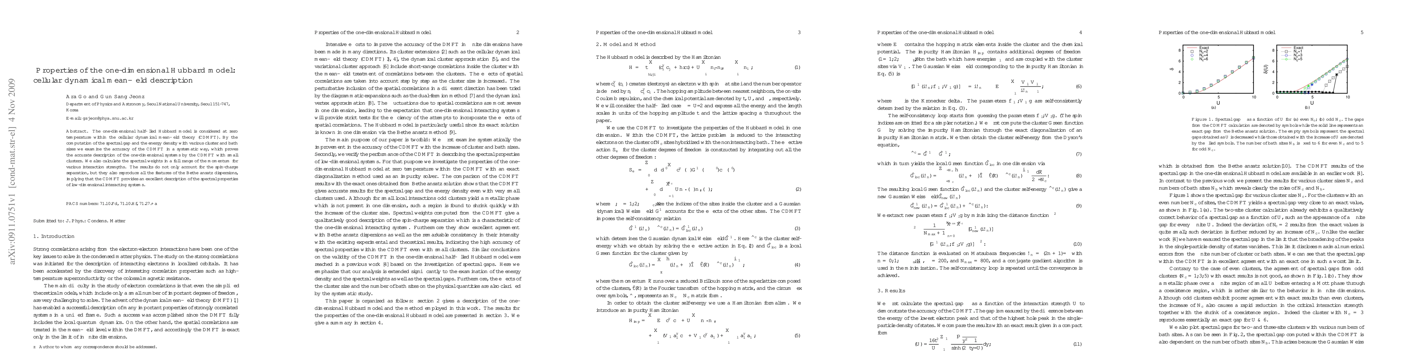 The paper investigates the one-dimensional half-filled Hubbard model using cellular dynamical mean-field theory (CDMFT) and finds it accurately describes spectral properties and energy density. The study confirms the model's effectiveness in capturing spin-charge separation and Bethe ansatz dispersions.