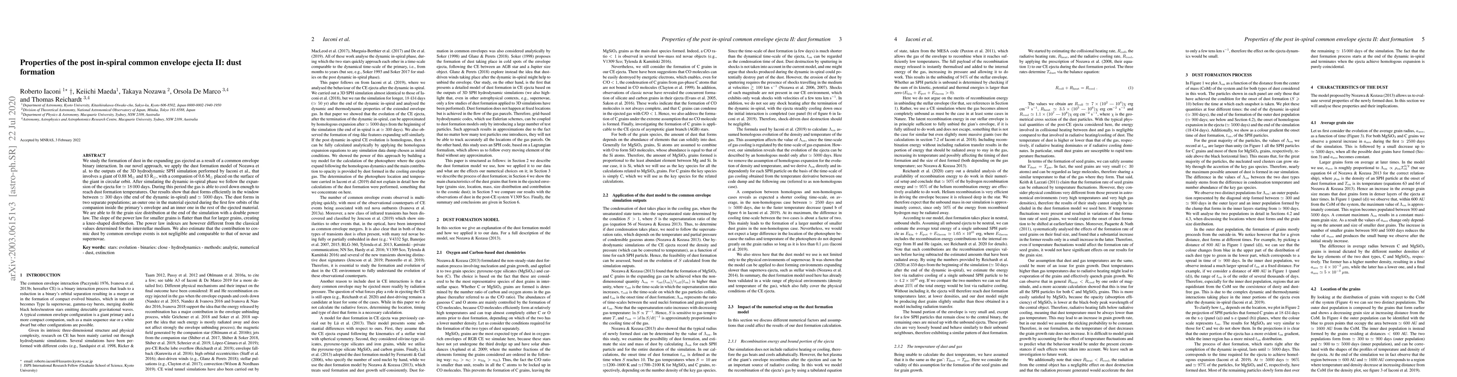 We study the formation of dust in the expanding gas ejected as a result of a common envelope binary interaction. In our novel approach, we apply the dust formation model of Nozawa et al. to the outputs of the 3D hydrodynamic SPH simulation performed by Iaconi et al., that involves a giant of 0.88~\ms \ and 83~\rs, with a companion of 0.6~\ms \ placed on the surface of the giant in circular orbit. After simulating the dynamic in-spiral phase we follow the expansion of the ejecta for $\simeq 18\,000$~days. During this period the gas is able to cool down enough to reach dust formation temperatures. Our results show that dust forms efficiently in the window between $\simeq 300$~days (the end of the dynamic in-spiral) and $\simeq 5000$~days. The dust forms in two separate populations; an outer one in the material ejected during the first few orbits of the companion inside the primary's envelope and an inner one in the rest of the ejected material. We are able to fit the grain size distribution at the end of the simulation with a double power law. The slope of the power law for smaller grains is flatter than that for larger grains, creating a knee-shaped distribution. The power law indexes are however different from the classical values determined for the interstellar medium. We also estimate that the contribution to cosmic dust by common envelope events is not negligible and comparable to that of novae and supernovae.
