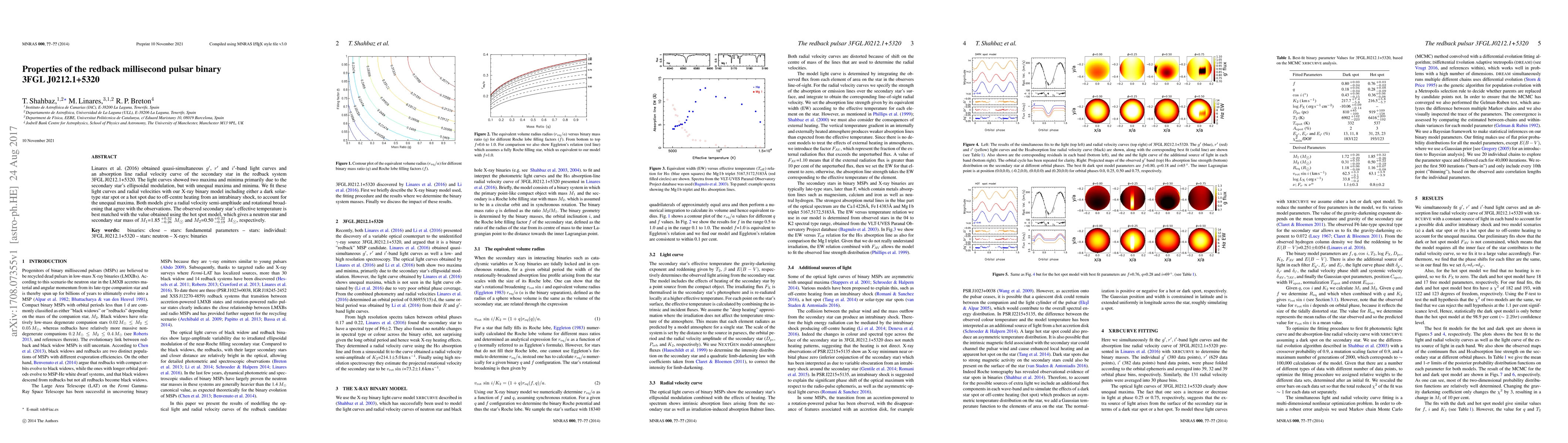 Linares et al. (2016) obtained quasi-simultaneous g', r' and i-band light curves and an absorption line radial velocity curve of the secondary star in the redback system 3FGL J0212.1+5320. The light curves showed two maxima and minima primarily due to the secondary star's ellipsoidal modulation, but with unequal maxima and minima. We fit these light curves and radial velocities with our X-ray binary model including either a dark solar-type star spot or a hot spot due to off-centre heating from an intrabinary shock, to account for the unequal maxima. Both models give a radial velocity semi-amplitude and rotational broadening that agree with the observations. The observed secondary star's effective temperature is best matched with the value obtained using the hot spot model, which gives a neutron star and secondary star mass of $M_{\rm 1}$=1.85$^{+0.32}_{-0.26}$ $M_{\odot}$and $M_{\rm 2}$=0.50$^{+0.22}_{-0.19}$ $M_{\odot}$, respectively.