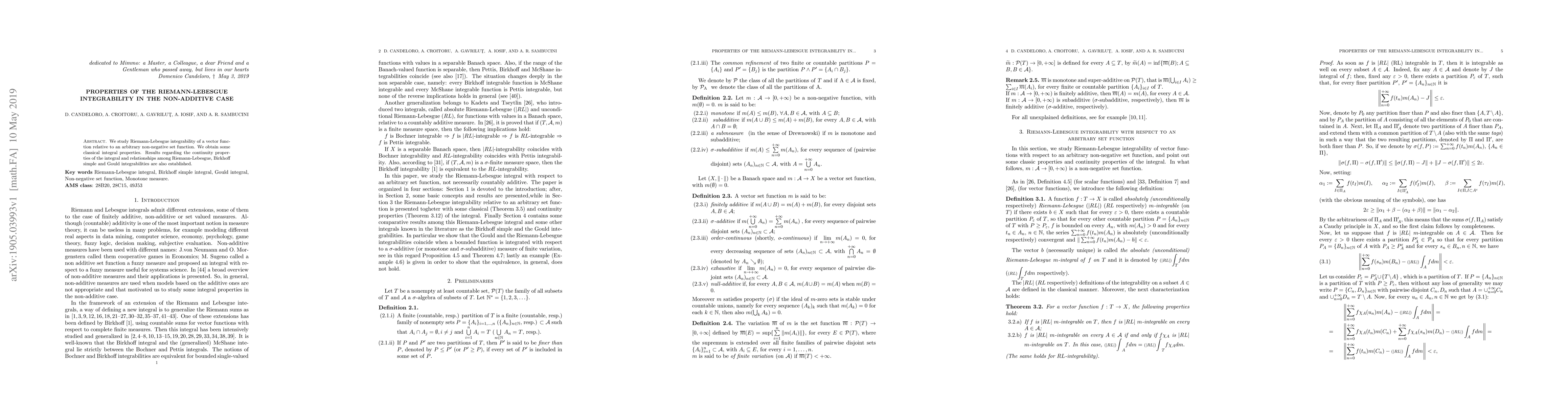 This paper investigates the Riemann-Lebesgue integrability of vector functions concerning non-negative set functions, establishing classical integral properties and exploring continuity and relationships with Birkhoff simple and Gould integrabilities.