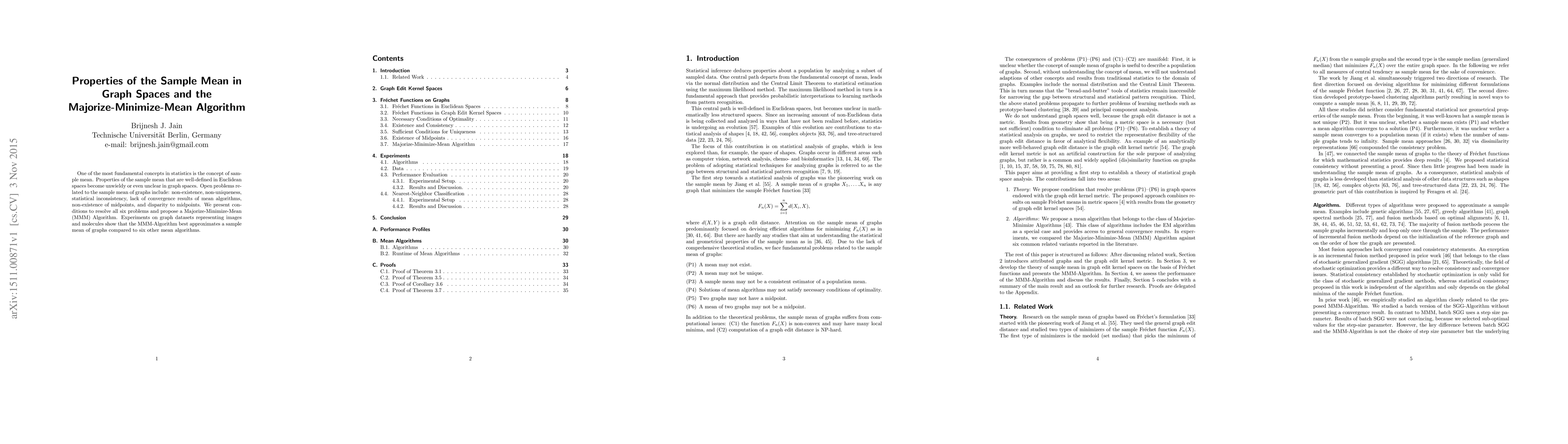 One of the most fundamental concepts in statistics is the concept of sample mean. Properties of the sample mean that are well-defined in Euclidean spaces become unwieldy or even unclear in graph spaces. Open problems related to the sample mean of graphs include: non-existence, non-uniqueness, statistical inconsistency, lack of convergence results of mean algorithms, non-existence of midpoints, and disparity to midpoints. We present conditions to resolve all six problems and propose a Majorize-Minimize-Mean (MMM) Algorithm. Experiments on graph datasets representing images and molecules show that the MMM-Algorithm best approximates a sample mean of graphs compared to six other mean algorithms.