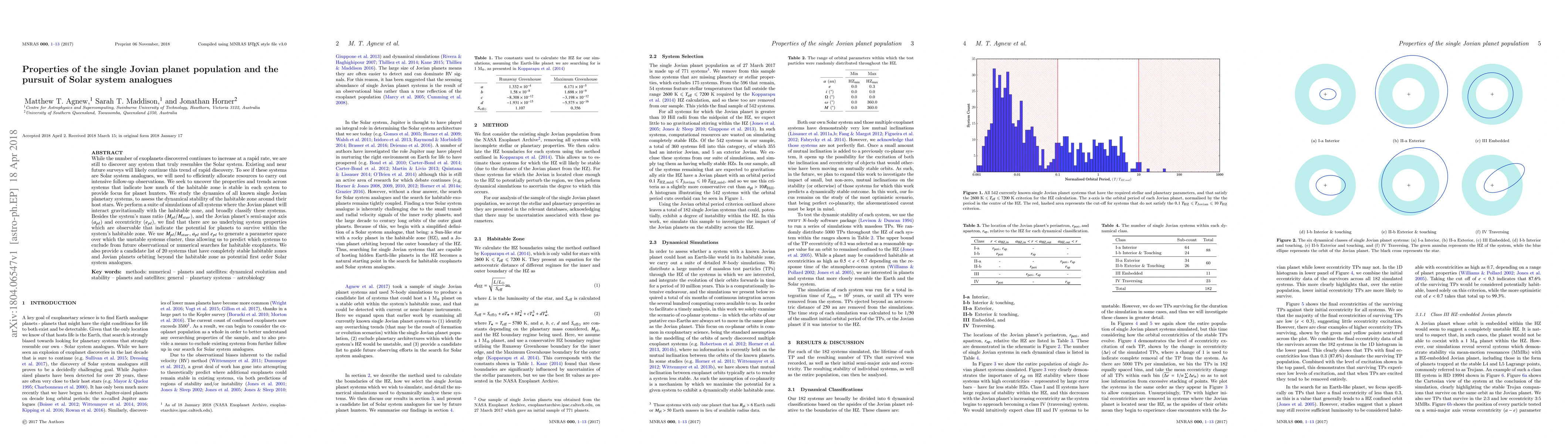 This research investigates the properties of single Jovian planet systems to identify potential Solar system analogues. The study finds no observable system properties that predict habitable zone stability, but uses mass ratio, semi-major axis, and eccentricity to classify systems and predict stability, ultimately providing a list of 20 systems with stable habitable zones as prime candidates.