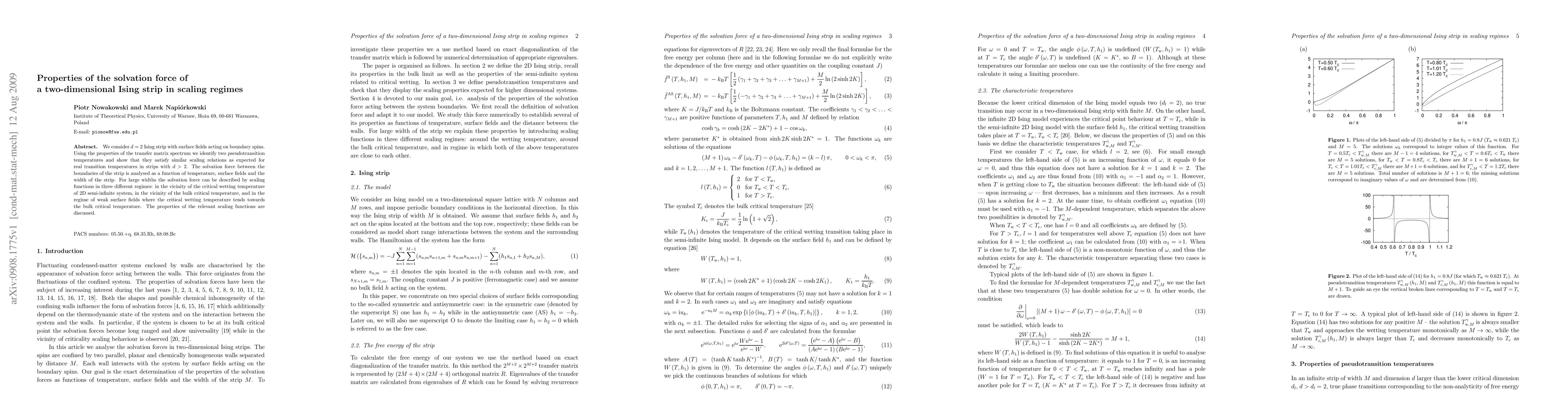 We consider d=2 Ising strip with surface fields acting on boundary spins. Using the properties of the transfer matrix spectrum we identify two pseudotransition temperatures and show that they satisfy similar scaling relations as expected for real transition temperatures in strips with d>2. The solvation force between the boundaries of the strip is analysed as a function of temperature, surface fields and the width of the strip. For large widths the solvation force can be described by scaling functions in three different regimes: in the vicinity of the critical wetting temperature of 2D semi-infinite system, in the vicinity of the bulk critical temperature, and in the regime of weak surface fields where the critical wetting temperature tends towards the bulk critical temperature. The properties of the relevant scaling functions are discussed.