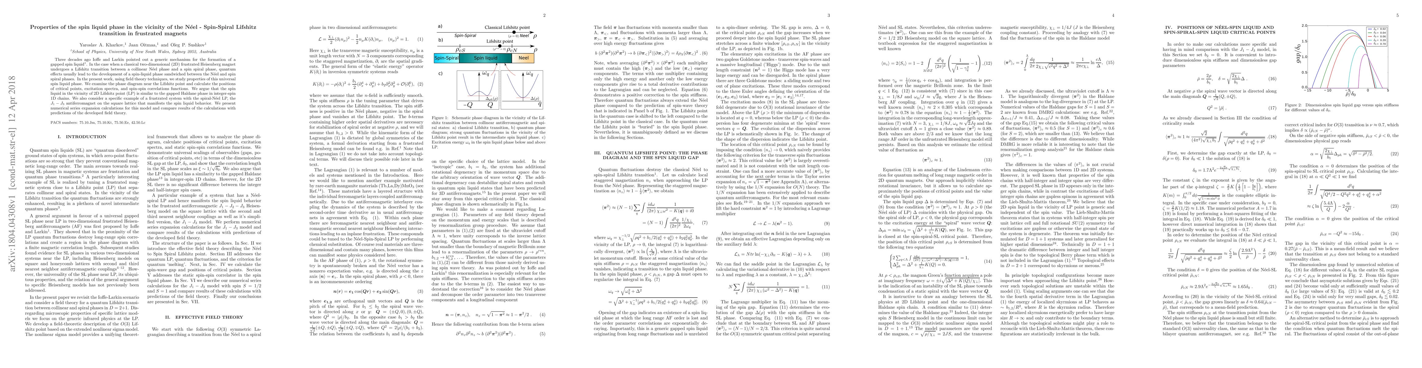 Three decades ago Ioffe and Larkin pointed out a generic mechanism for the formation of a gapped spin liquid. In the case when a classical two-dimensional (2D) frustrated Heisenberg magnet undergoes a Lifshitz transition between a collinear N\'eel phase and a spin spiral phase, quantum effects usually lead to the development of a spin-liquid phase sandwiched between the N\'eel and spin spiral phases. In the present work, using field theory techniques, we study properties of this universal spin liquid phase. We examine the phase diagram near the Lifshitz point and calculate the positions of critical points, excitation spectra, and spin-spin correlations functions. We argue that the spin liquid in the vicinity of 2D Lifshitz point (LP) is similar to the gapped Haldane phase in integer-spin 1D chains. We also consider a specific example of a frustrated system with the spiral-N\'eel LP, the $J_1-J_3$ antiferromagnet on the square lattice that manifests the spin liquid behavior. We present numerical series expansion calculations for this model and compare results of the calculations with predictions of the developed field theory.