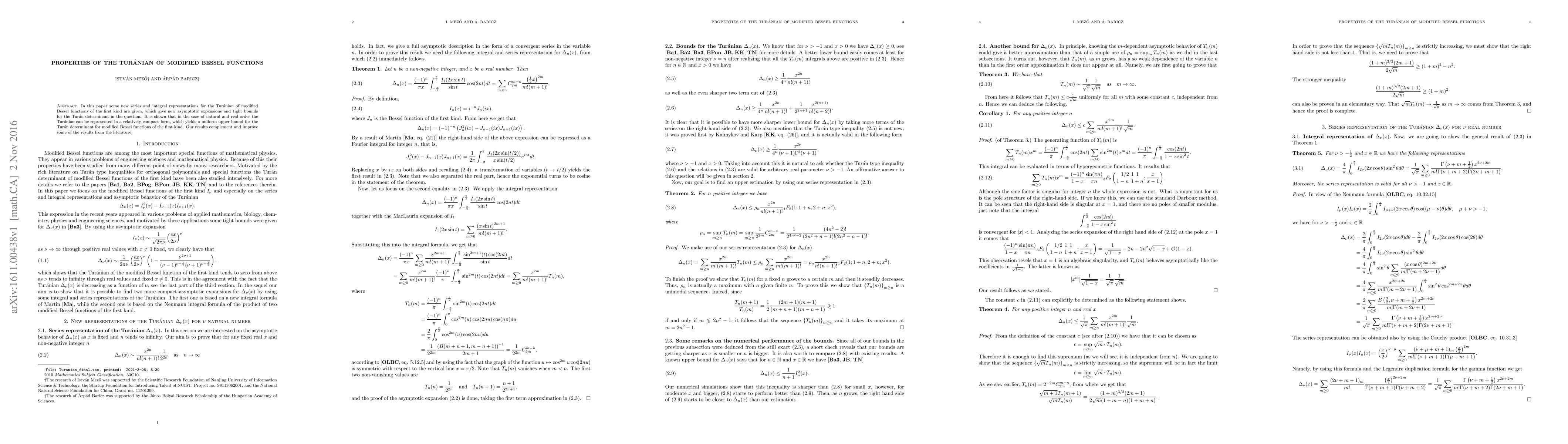 This paper presents new series and integral representations for the Tur\'anian of modified Bessel functions, providing new asymptotic expansions and tight bounds for the Tur\'an determinant. It also shows a relatively compact form for natural and real orders, yielding a uniform upper bound for the determinant.