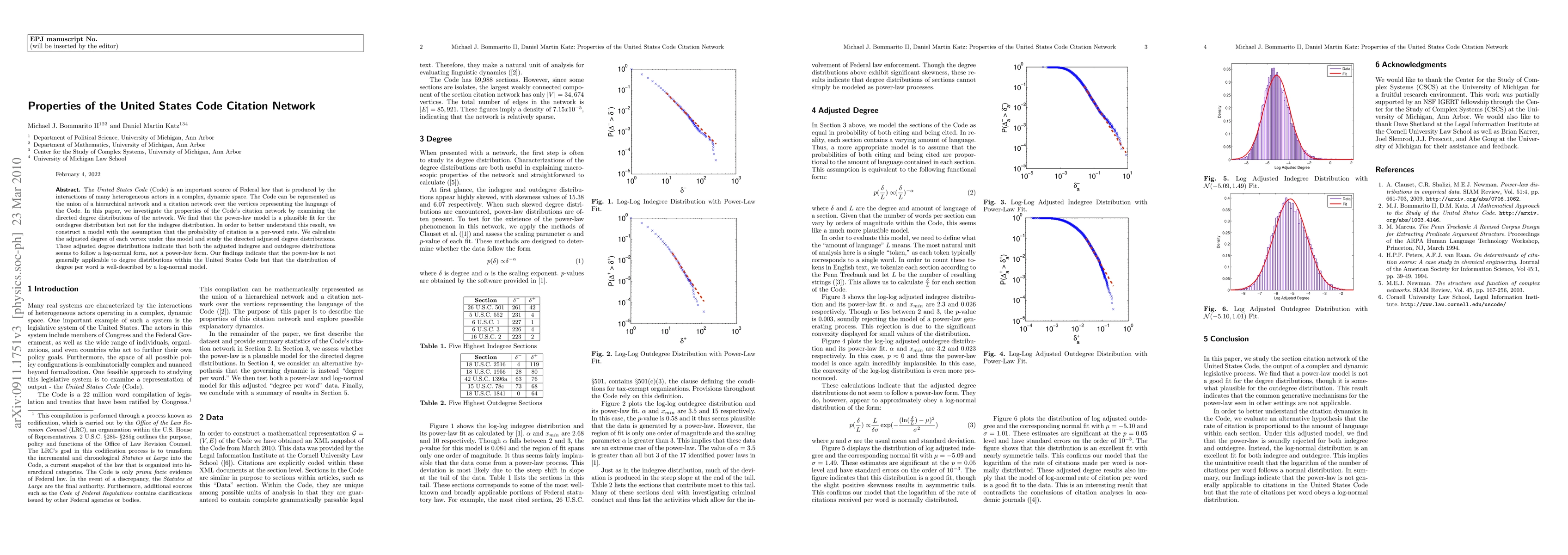 This paper examines the citation network of the United States Code, finding that while the outdegree distribution fits a power-law model, the indegree does not. A log-normal model better describes the adjusted degree distributions when considering citation per word, suggesting that degree distributions in the Code are not generally power-law but follow a log-normal form when normalized.