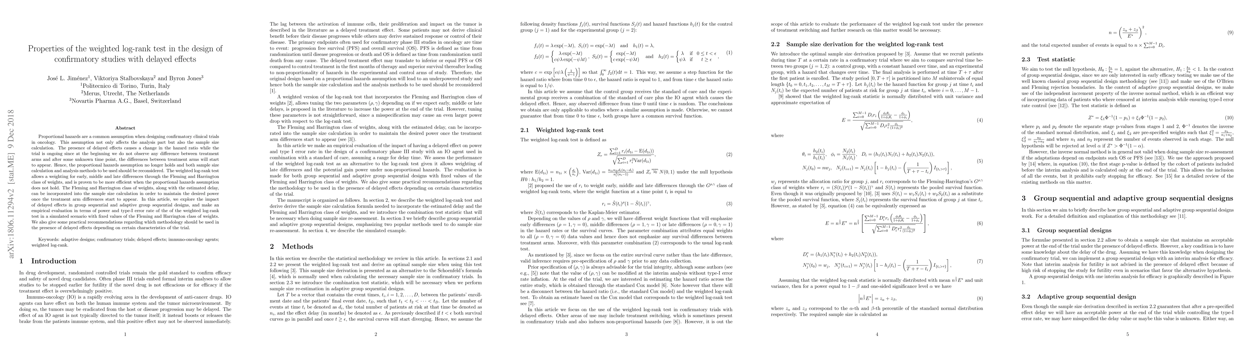This paper investigates the properties of the weighted log-rank test for confirmatory studies in oncology where delayed treatment effects occur. It evaluates the test's efficiency and power in scenarios where the proportional hazards assumption is violated, providing practical recommendations for its use in group sequential and adaptive designs.