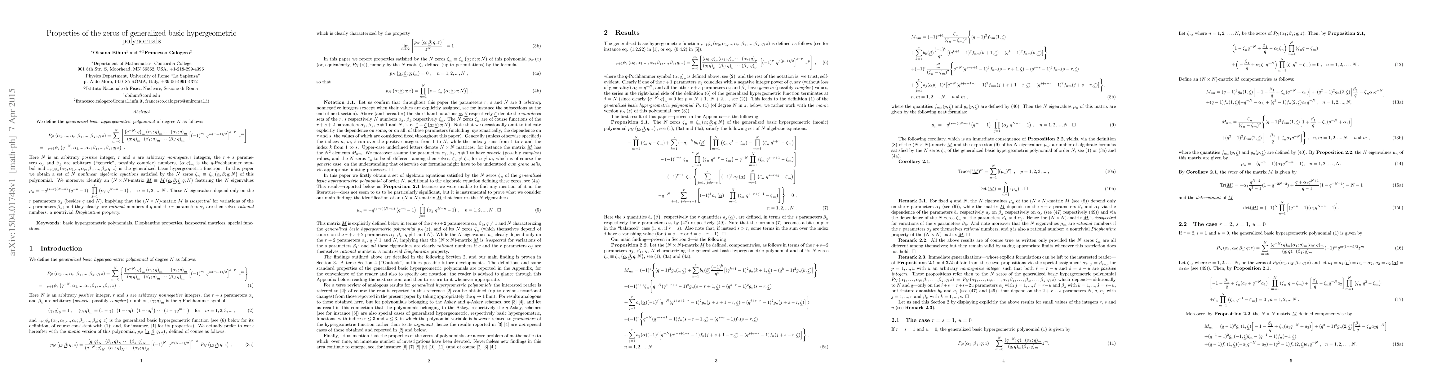 We define the generalized basic hypergeometric polynomial of degree $N \geq 1$ in terms of the generalized basic hypergeometric function, which depends on (arbitrary, generic, possibly complex) parameters $q \neq 1$, the $r \geq 0$ parameters $\alpha _{j}$ and the $s \geq 0$ parameters $\beta _{k}$. In this paper we obtain a set of $N$ nonlinear algebraic equations satisfied by the $N$ zeros $\zeta _{n}\equiv \zeta _{n}\left( \underline{\alpha },\underline{\beta };q;N\right) $ of this polynomial. We moreover identify an $\left( N\times N\right) $-matrix $\underline{M}\equiv \underline{M}\left( \underline{\alpha },\underline{\beta };\underline{\zeta };q;N\right) $ featuring the $N$ eigenvalues $\mu _{n}=-q^{\left( s-r\right) \left( N-n\right) }\left(q^{-n}-1\right) ~\prod\limits_{j=1}^{r}\left( \alpha _{j}~q^{N-n}-1\right)$, where $n=1,2,...,N.$ These $N$ eigenvalues depend only on the $r$ parameters $\alpha _{j}$ (besides $q$ and $N$), implying that the $\left( N\times N\right) $-matrix $\underline{M}$ is isospectral for variations of the $s$ parameters $\beta _{k}$; and they clearly are rational numbers if $q$ and the $r$ parameters $\alpha _{j}$ are themselves rational numbers: a nontrivial Diophantine property.