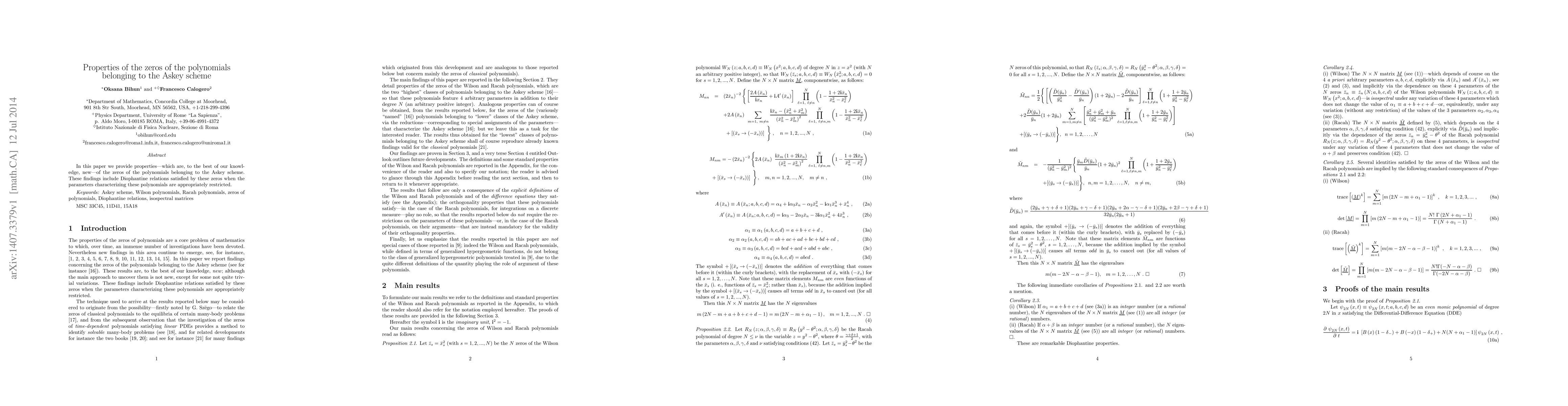 Researchers discovered new Diophantine relations among zeros of polynomials in the Askey scheme, shedding light on their properties when parameters are restricted.