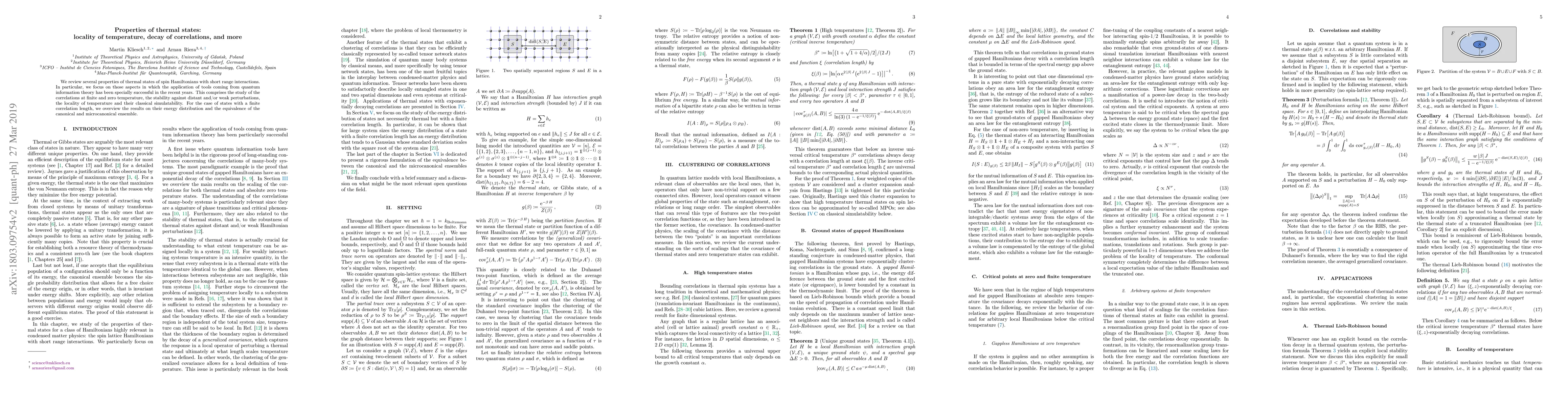 This paper reviews properties of thermal quantum states in spin Hamiltonians, including correlations at finite and zero temperature, stability against perturbations, and classical simulatability. It focuses on key findings related to correlation length, energy distribution, and ensemble equivalence.