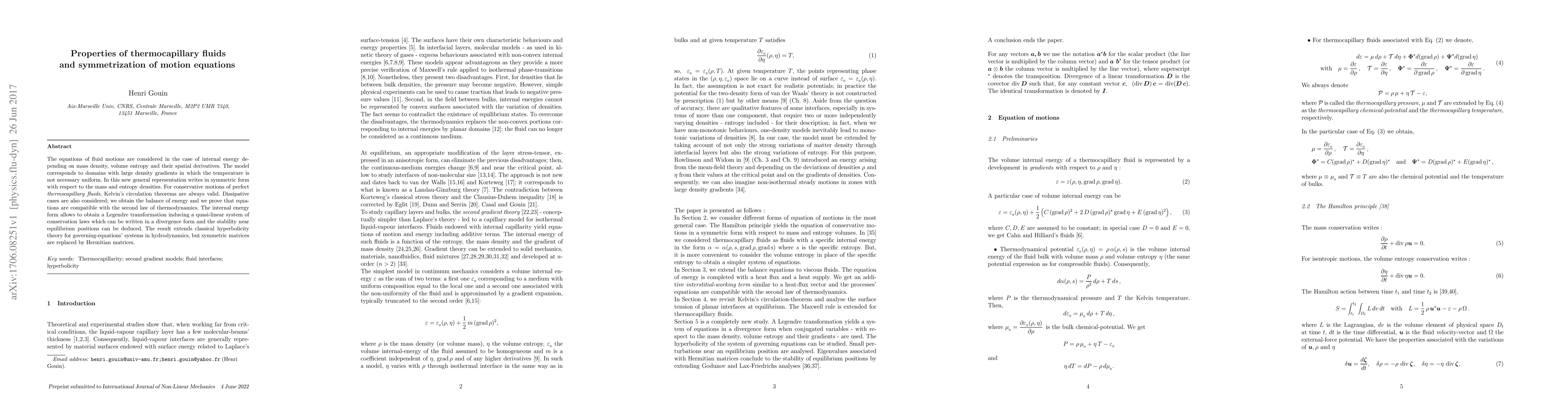 The equations of fluid motions are considered in the case of internal energy depending on mass density, volume entropy and their spatial derivatives. The model corresponds to domains with large density gradients in which the temperature is not necessary uniform. In this new general representation writes in symmetric form with respect to the mass and entropy densities. For conservative motions of perfect thermocapillary fluids, Kelvin's circulation theorems are always valid. Dissipative cases are also considered; we obtain the balance of energy and we prove that equations are compatible with the second law of thermodynamics. The internal energy form allows to obtain a Legendre transformation inducing a quasi-linear system of conservation laws which can be written in a divergence form and the stability near equilibrium positions can be deduced. The result extends classical hyperbolicity theory for governing-equations' systems in hydrodynamics, but symmetric matrices are replaced by Hermitian matrices.