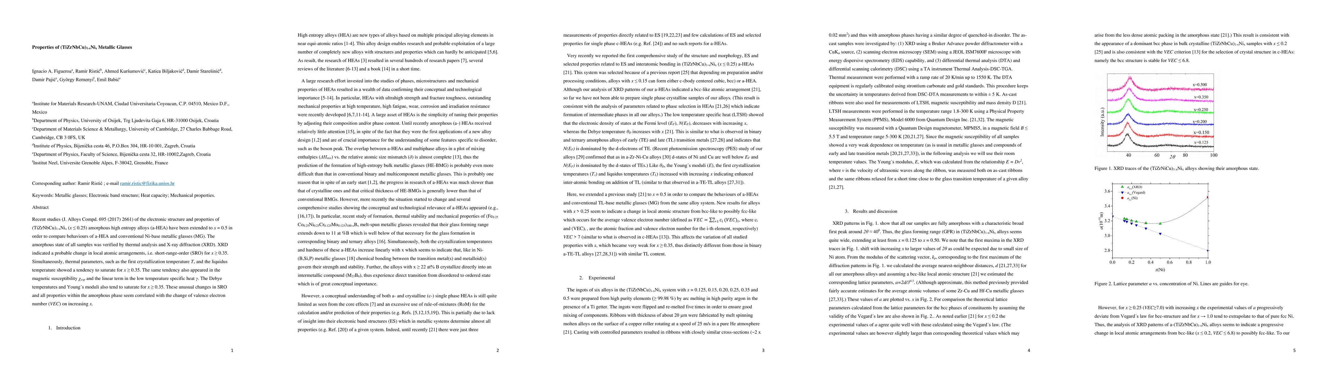 This study investigates the electronic structure and properties of $(TiZrNbCu)_{1-x}Ni_{x}$ metallic glasses as the Ni concentration increases to x=0.5, revealing a probable shift in local atomic arrangements and saturation of thermal, magnetic, and mechanical properties for x≥0.35, correlating these changes with the valence electron concentration.