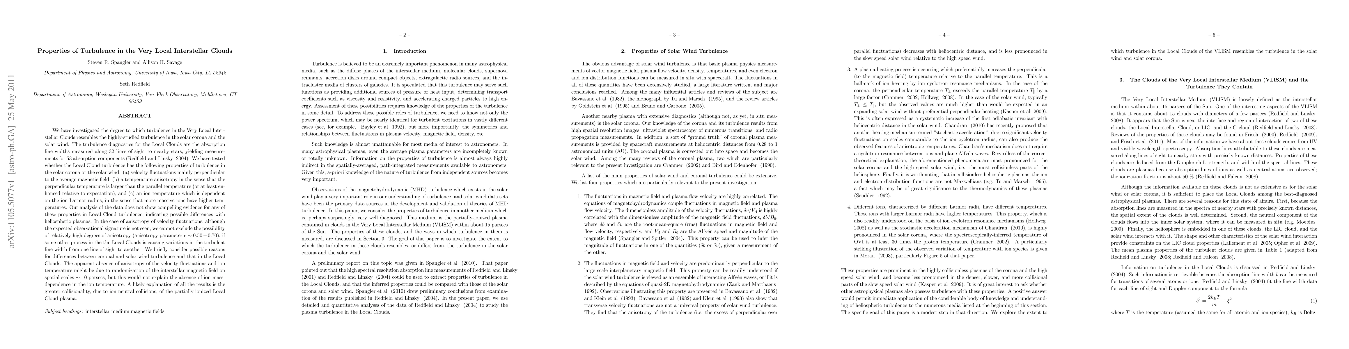 We have investigated the degree to which turbulence in the Very Local Interstellar Clouds resembles the highly-studied turbulence in the solar corona and the solar wind. The turbulence diagnostics for the Local Clouds are the absorption line widths measured along 32 lines of sight to nearby stars, yielding measurements for 53 absorption components (Redfield and Linsky 2004). We have tested whether the Local Cloud turbulence has the following properties of turbulence in the solar corona or the solar wind: (a) velocity fluctuations mainly perpendicular to the average magnetic field, (b) a temperature anisotropy in the sense that the perpendicular temperature is larger than the parallel temperature (or at least enhanced relative to expectation), and (c) an ion temperature which is dependent on the ion Larmor radius, in the sense that more massive ions have higher temperatures. Our analysis of the data does not show compelling evidence for any of these properties in Local Cloud turbulence, indicating possible differences with heliospheric plasmas. In the case of anisotropy of velocity fluctuations, although the expected observational signature is not seen, we cannot exclude the possibility of relatively high degrees of anisotropy (anisotropy parameter $\epsilon \sim 0.50 - 0.70$), if some other process in the the Local Clouds is causing variations in the turbulent line width from one line of sight to another. We briefly consider possible reasons for differences between coronal and solar wind turbulence and that in the Local Clouds.