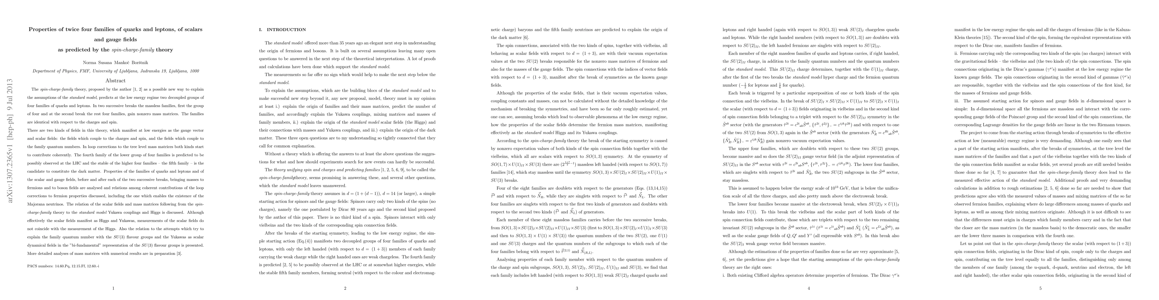 The spin-charge-family theory, proposed by the author as a possible new way to explain the assumptions of the standard model, predicts at the low energy regime two decoupled groups of four families of quarks and leptons. In two successive breaks the massless families, first the group of four and at the second break the rest four families, gain nonzero mass matrices. The families are identical with respect to the charges and spin. There are two kinds of fields in this theory, which manifest at low energies as the gauge vector and scalar fields: the fields which couple to the charges and spin, and the fields which couple to the family quantum numbers. In loop corrections to the tree level mass matrices both kinds start to contribute coherently. The fourth family of the lower group of four families is predicted to be possibly observed at the LHC and the stable of the higher four families -- the fifth family -- is the candidate to constitute the dark matter. Properties of the families of quarks and leptons and of the scalar and gauge fields, before and after each of the two successive breaks, bringing masses to fermions and to boson fields are analysed and relations among coherent contributions of the loop corrections to fermion properties discussed, including the one which enables the existence of the Majorana neutrinos. The relation of the scalar fields and mass matrices following from the {\em spin-charge-family} theory to the {\it standard model} Yukawa couplings and Higgs is discussed. Although effectively the scalar fields manifest as Higgs and Yukawas, measurements of the scalar fields do not coincide with the measurement of the Higgs.