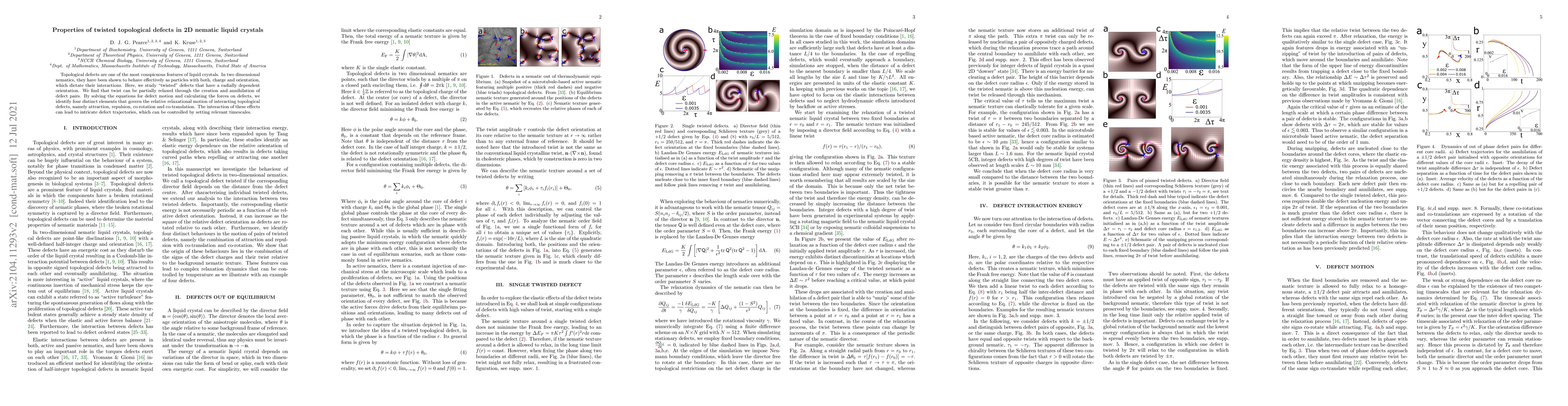 This paper investigates the behavior of twisted topological defects in 2D nematic liquid crystals, revealing that twist can relax through defect pair dynamics. Four key elements—attraction, repulsion, co-rotation, and co-translation—govern defect interactions, allowing control over defect trajectories via relevant timescales.