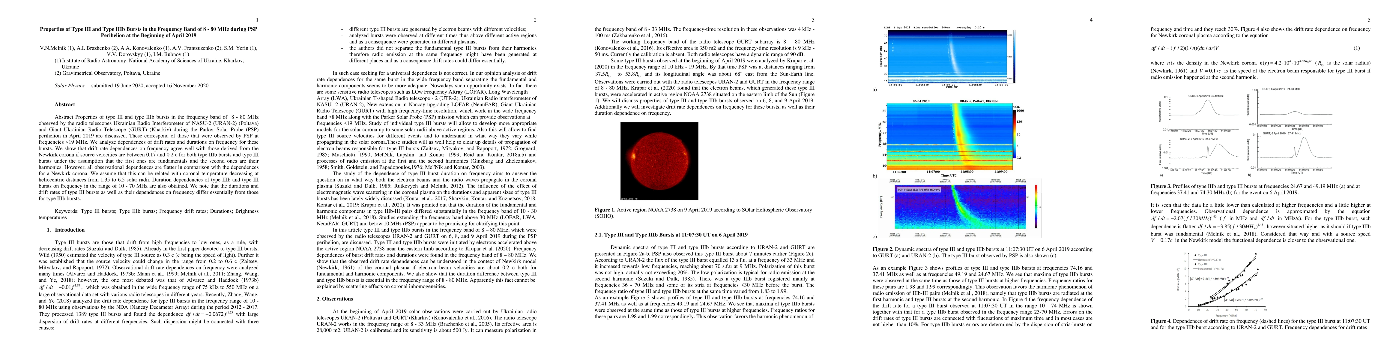 Properties of type III and type IIIb bursts in the frequency band of 8-80 MHz observed by the radio telescopes Ukrainian Radio Interferometer of NASU-2 (URAN-2) (Poltava) and Giant Ukrainian Radio Telescope (GURT) (Kharkiv) during the Parker Solar Probe (PSP) perihelion in April 2019 are discussed. These correspond of those that were observed by PSP at frequencies <19 MHz. We analyze dependences of drift rates and durations on frequency for these bursts. We show that drift rate dependences on frequency agree well with those derived from the Newkirk corona if source velocities are between 0.17 and 0.2 c for both type IIIb bursts and type III bursts under the assumption that the first ones are fundamentals and the second ones are their harmonics. However, all observational dependences are flatter in comparison with the dependences for a Newkirk corona. We assume that this can be related with coronal temperature decreasing at heliocentric distances from 1.35 to 6.5 solar radii. Duration dependencies of type IIIb and type III bursts on frequency in the range of 10-70 MHz are also obtained. We note that the durations and drift rates of type III bursts as well as their dependences on frequency differ essentially from those for type IIIb bursts.
